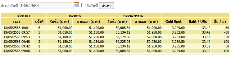 ขณะที่ทองคำไทย สมาคมค้าทองคำ ประกาศครั้งแรกวันนี้ขยับขึ้น 100 บาท/บาททองคำ ทองแท่งขายออก 51,100 บาท ทองสำเร็จรูปขายออก 51,900 บาท เนื่องจากราคา GOLD SPOT ขยับขึ้นเล็กน้อยจากปิดตลาดวานนี้ โดยเคลื่อนไหว 3,229 ดอลลาร์สหรัฐ/ออนซ์ เงินบาทอ่อนค่าที่ประมาณ 33.42 บาท/ดอลลาร์