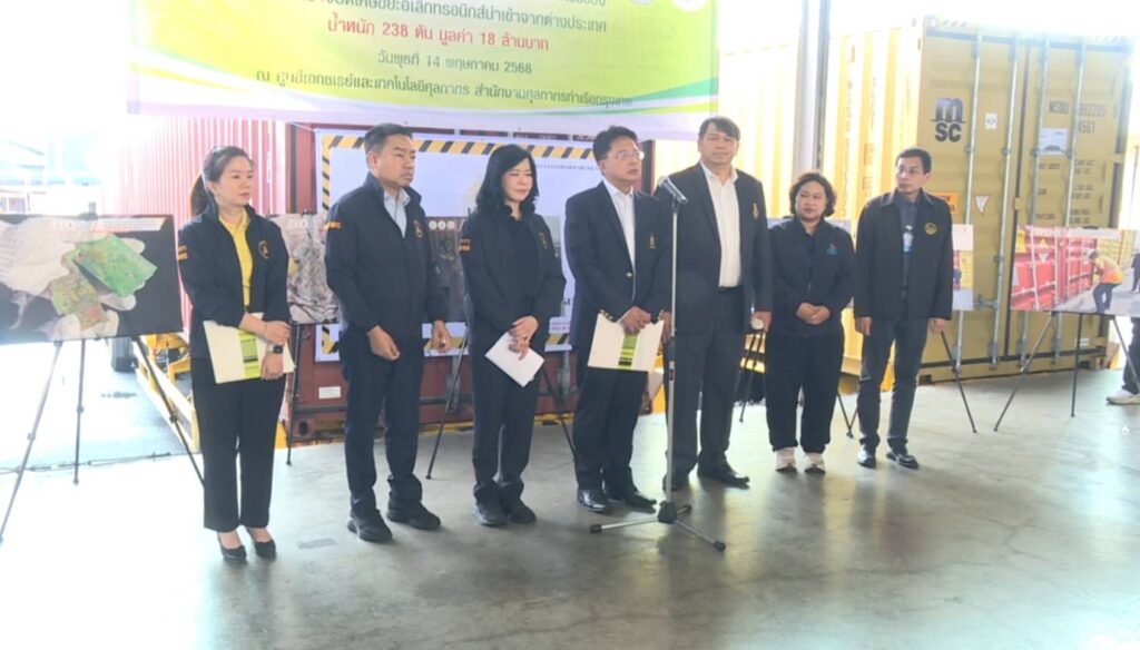 กรุงเทพฯ 14 พ.ค. – กรมศุลกากร-กรมโรงงานอุตสาหกรรม ตรวจยึดเศษขยะอิเล็กทรอนิกส์นำเข้าจากต่างประเทศ น้ำหนัก 238 ตัน มูลค่ากว่า 18 ล้านบาท เตรียมขยายผลตรวจโรงงานนำเข้า 2 แห่งใน จ.สมุทรสาคร มองไม่กระทบเจรจาการค้าไทย-สหรัฐ