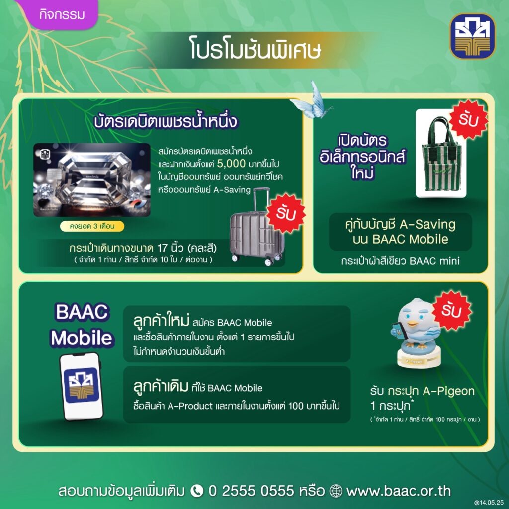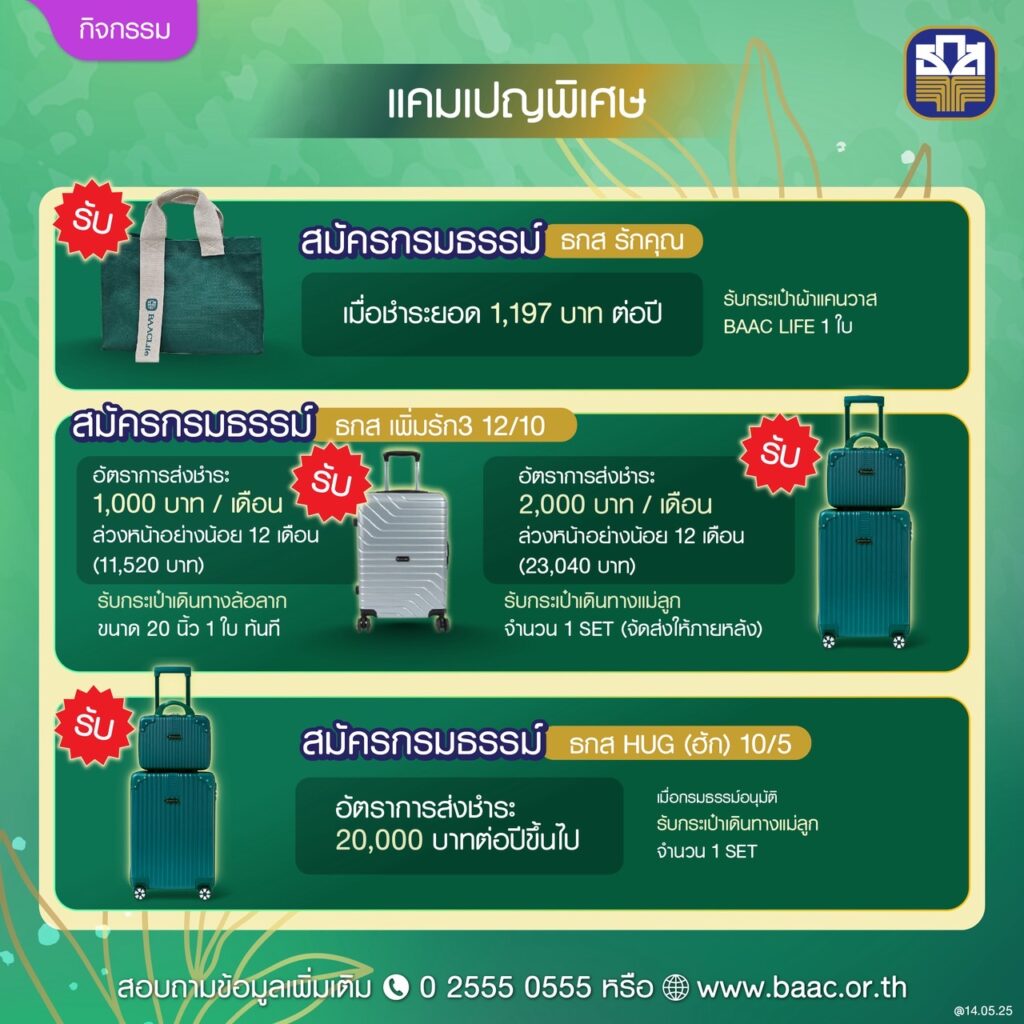 นอกจากนี้ ยังมีผลิตภัณฑ์เงินฝากสงเคราะห์ชีวิต ซึ่งถือเป็นทางเลือกในการออมเงินที่มาพร้อมความคุ้มครองและสิทธิประโยชน์ในการลดหย่อนภาษี ที่คัดโปรโมชันพิเศษมานำเสนอ ประกอบด้วย เมื่อสมัครกรมธรรม์ ธกส เพิ่มรัก3 12/10 ส่งชำระ 1,000 บาท/เดือน ชำระล่วงหน้าอย่างน้อย 12 เดือน(11,520 บาท) รับกระเป๋าเดินทาง 4 ล้อลาก ขนาด 20 นิ้ว 1 ใบ หรือส่งชำระ 2,000 บาทต่อเดือน ชำระล่วงหน้าอย่างน้อย 12 เดือน (23,040 บาท) หรือเมื่อสมัครกรมธรรม์ ธกส Hug(ฮัก) 10/5 ส่งชำระ 20,000 บาทต่อปีขึ้นไป เมื่อกรมธรรม์อนุมัติ รับเลยกระเป๋าเดินทางแม่ลูก จำนวน 1 เซต (ประกอบด้วย 2 ใบ คือ กระเป๋าเดินทาง 4 ล้อลาก ขนาด 20 นิ้ว และกระเป๋าเดินทางแบบหิ้ว ขนาด 14 นิ้ว) และสมัครกรมธรรม์ ธกส รักคุณ แบบ 2 โดยส่งชำระ 1,197 บาทต่อปี รับกระเป๋าผ้าแคนวาส BAAC Life