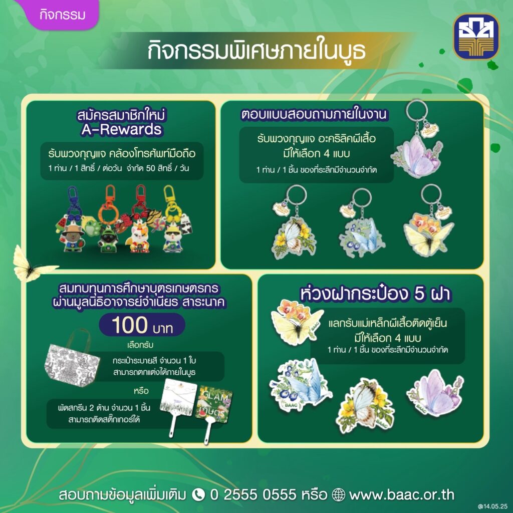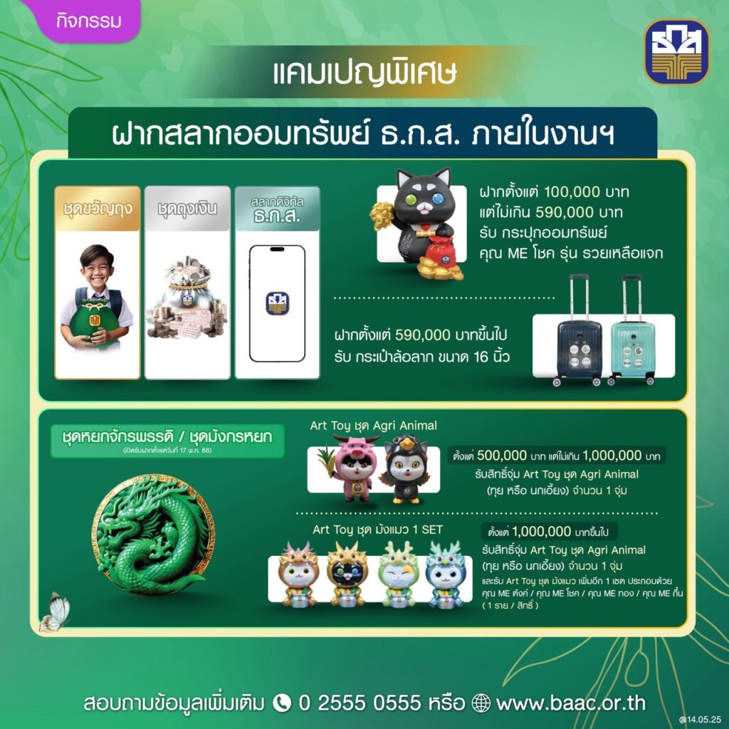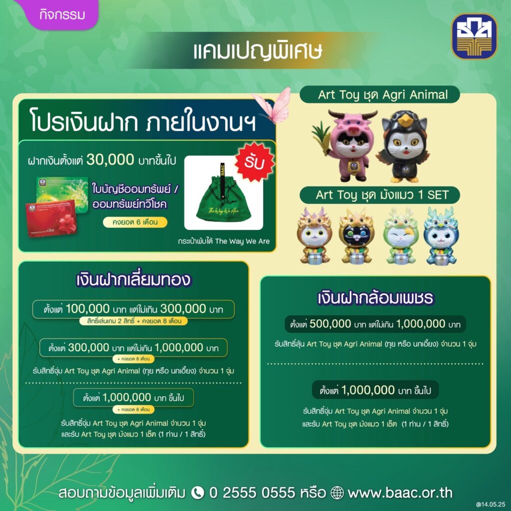 ธ.ก.ส. จัดโปรเด็ดแคมเปญพิเศษ เปิดตัว Art Toy ชุดใหม่ “AGRI ANIMAL” ประเดิม 2 Character แรก “ทุย” และ “นกเอี้ยง” เฉพาะในงาน! เมื่อฝากสลากออมทรัพย์ ธ.ก.ส. ชุดหยกจักรพรรดิ หรือชุดมังกรหยก หรือฝากเงินฝากล้อมเพชร หรือเงินฝากเลี่ยมทอง ตามจำนวนที่ธนาคารกำหนด รับสิทธิ์ 1 จุ่ม กรณีฝากตั้งแต่ 1 ล้านบาทขึ้นไป รับสิทธิ์ 1 จุ่ม พร้อมได้รับเพิ่ม Art Toy ชุดมังแมว 4 ตัวครบเซต พร้อมกับเปิดรับฝากสลากออมทรัพย์ ธ.ก.ส. ชุดมังกรหยก เป็นครั้งแรก ในวันที่ 17 พ.ค. 68 เพียงหน่วยละ 100 บาท ลุ้นรับรางวัล 10 ล้านบาท ตลอด 24 เดือน นอกจากนี้ ยังสามารถเลือกซื้อสินค้าแกลมเกษตรคุณภาพดีจากลูกค้า ธ.ก.ส. ทั่วประเทศที่มาจำหน่ายในงานมหกรรมการเงินกรุงเทพ ครั้งที่ 25 Money Expo 2025 Bangkok วันที่ 15 – 18 พ.ค.นี้ ณ ชาเลนเจอร์ 2 – 3 อิมแพ็ค เมืองทองธานี