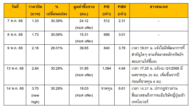 ทั้งนี้ วันที่ 14 พฤษภาคม 2568 เวลา 15.27 น. ปรากฏข่าวผ่านสื่อมวลชนโดยระบุแหล่งข่าวจากผู้ลงทุนกล่าวว่า มีกระแสข่าวลือว่าบริษัทชื่อดังจากญี่ปุ่นเข้าเทคโอเวอร์ เตรียมประกาศตั้งโต๊ะรับซื้อหุ้น (เทนเดอร์ ออฟเฟอร์) เร็วๆ นี้ รวมทั้งเปลี่ยนบอร์ดบริหารใหม่ทั้งหมด ซึ่ง บมจ. ดีวี8 ได้ชี้แจงผ่านระบบตลาดหลักทรัพย์ฯ แล้วในวันที่ 15 พฤษภาคม 2568 เวลา 09.09 น. ตามที่ตลาดหลักทรัพย์ฯ สอบถาม ว่าขณะนี้บริษัทฯ ยังไม่มีการพัฒนาการใดๆ ซึ่งอาจส่งผลต่อปริมาณและราคาการซื้อขายหลักทรัพย์ของบริษัทฯ ยังไม่มีผู้ลงทุนหรือบุคคลใดติดต่อมายังบริษัทฯ และยังไม่มีการเปลี่ยนแปลงของคณะกรรมการบริหารแต่อย่างใด ตลาดหลักทรัพย์ฯ จึงขอให้ผู้ลงทุนใช้ความระมัดระวังในการซื้อขายหลักทรัพย์ DV8 โดยขอให้พิจารณาปัจจัยพื้นฐานและข้อมูลต่างๆ ที่น่าเชื่อถือประกอบให้รอบคอบก่อนการลงทุน. -511-สำนักข่าวไทย