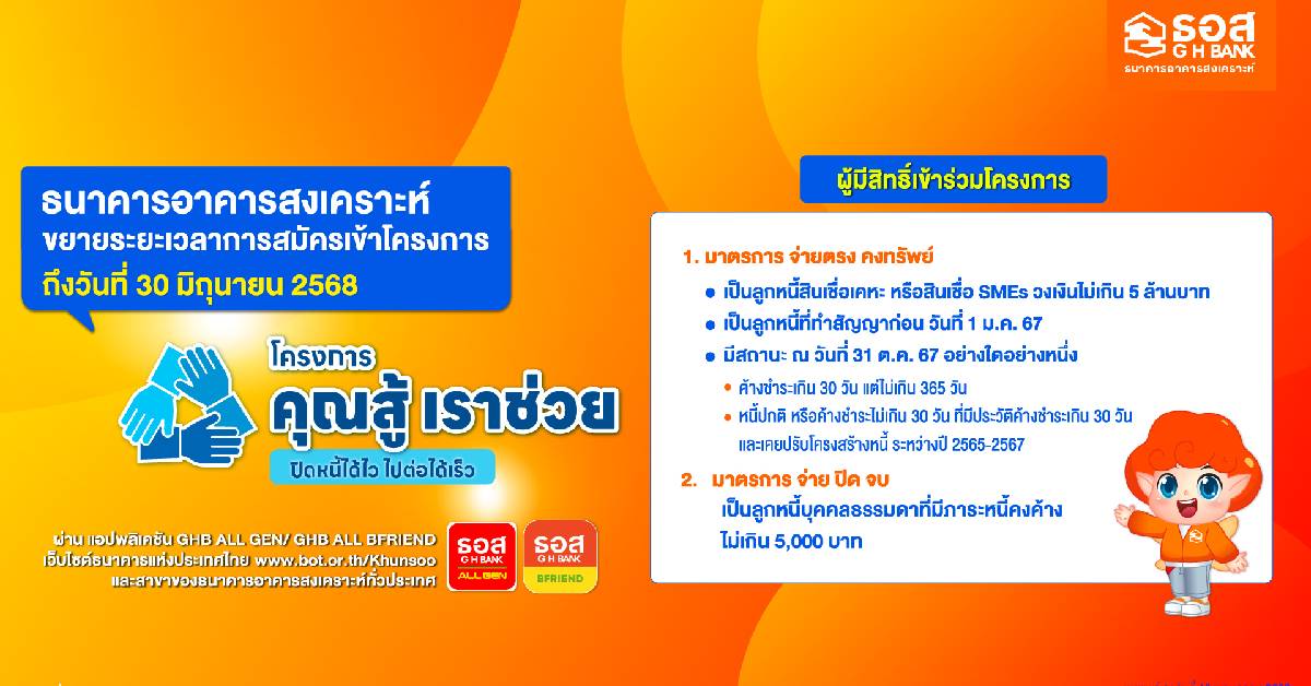 กรุงเทพฯ 16 พ.ค. – ธอส.ขยายเวลาช่วยคนไทยรักษาบ้านของตนเอง เปิดลงทะเบียน “โครงการคุณสู้ เราช่วย” ถึงวันที่ 30 มิถุนายน 2568