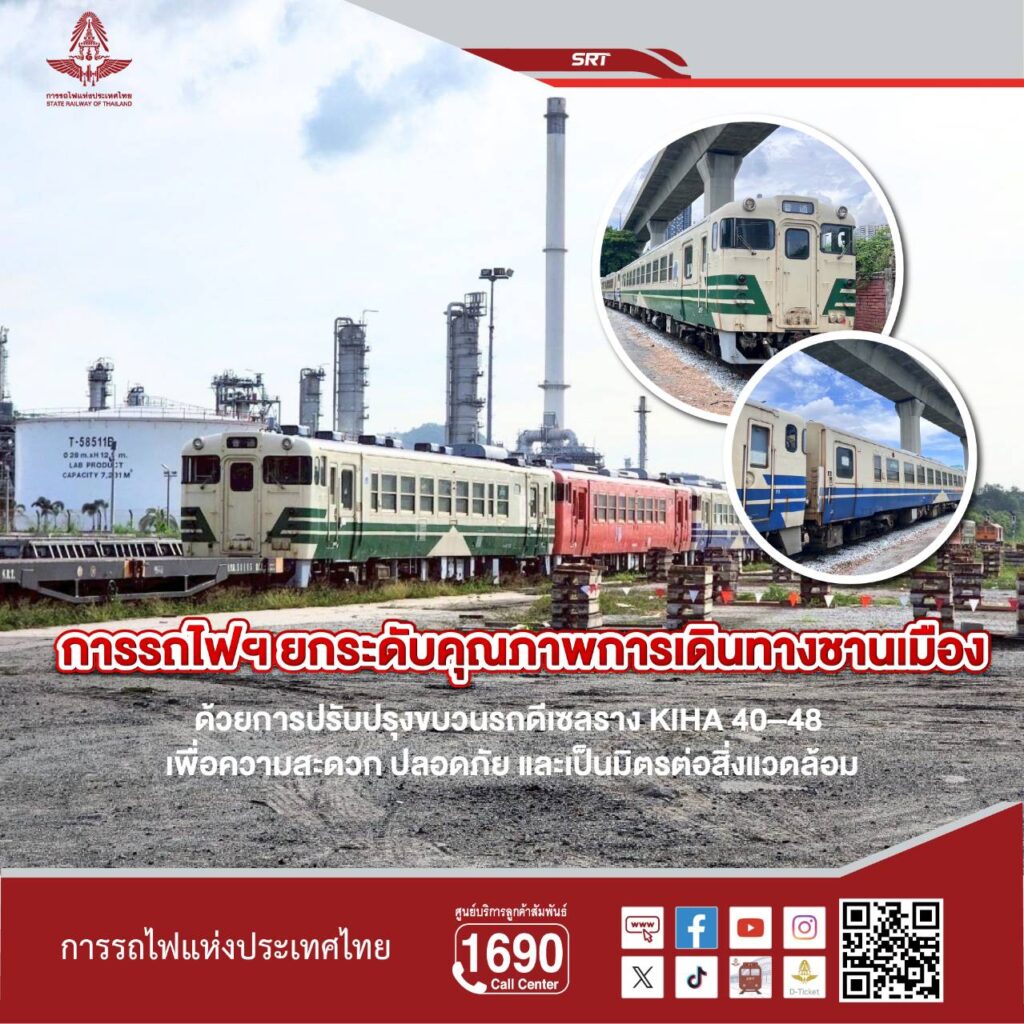 การรถไฟฯ นำขบวนรถดีเซลรางปรับอากาศ KIHA 40 และ 48 ทั้ง 20 คัน กลับถึงโรงงานมักกะสันเรียบร้อยแล้ว พร้อมดำเนินการลุยปรับปรุงภายในและภายนอก เพื่อยกระดับคุณภาพการเดินทางของประชาชนให้ สะดวก ปลอดภัย และเหมาะกับไลฟ์สไตล์ยุคใหม่