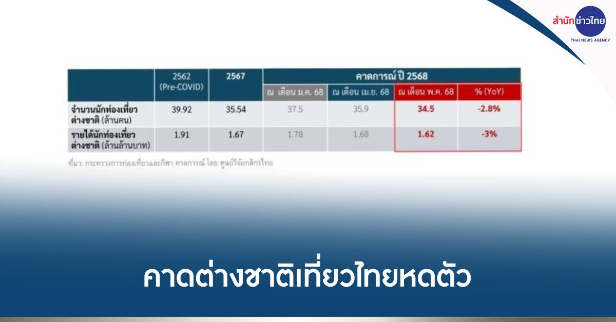 ศูนย์วิจัยกสิกรไทยวิเคราะห์ว่ามี หลายเหตุการณ์ที่เกิดขึ้น มีผลต่อตลาดนักท่องเที่ยวต่างชาติเที่ยวไทย โดยตั้งแต่ 1 ม.ค.-11 พ.ค. 2568 ชาวต่างชาติเที่ยวไทยมีจำนวน 12.9 ล้านคน หดตัว 1% (YoY) ปัจจัยลบยังอยู่และอาจมากขึ้นในช่วงที่เหลือของปีนี้ ทั้งเศรษฐกิจโลกชะลอตัว ความสามารถในการแข่งขันด้านการท่องเที่ยวของไทยลดลง พฤติกรรมนักท่องเที่ยวและความต้องการด้านการท่องเที่ยวเปลี่ยนไป รวมถึงปัจจัยที่ควบคุมไม่ได้อย่างปัญหาภูมิรัฐศาสตร์