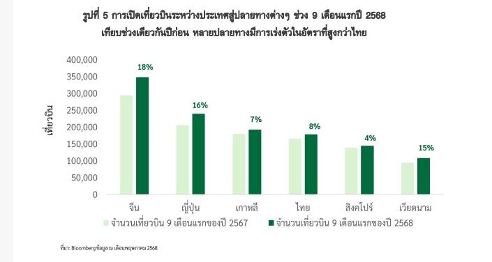 ขณะเดียวกัน แผนการจัดเที่ยวบินของสายการบินไปข้างหน้า ก็สะท้อนสัญญาณที่ตอบรับความสนใจในจุดหมายปลายทางใหม่ๆ ของนักท่องเที่ยว จากการเปิดเผยเที่ยวบินระหว่างประเทศของสายการบินที่มีกำหนดการล่วงหน้าไปถึงเดือนกันยายน 2568 บ่งชี้ว่า เที่ยวบินระหว่างประเทศที่มีปลายทางสู่จีน เติบโต 18% (9 เดือนแรกปี 2568 เทียบ 9 เดือนแรกปี 2567) ญี่ปุ่น เติบโต 16% ส่วนไทย เพิ่มขึ้นเพียง 8%.-511.-สำนักข่าวไทย