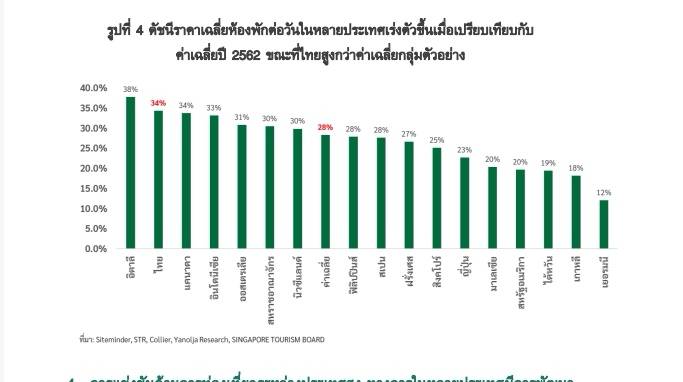 นอกจากนี้ราคาสินค้าบริการท่องเที่ยวไทยปรับตัวเร่งขึ้นเมื่อเทียบกับหลายประเทศ สะท้อนจากเครื่องชี้ราคาเฉลี่ยห้องพักต่อวันในไทย (Average Daily Rate) ในปี 2567 ปรับตัวสูงขึ้นถึง 34% เทียบกับในปี 2562 หรือก่อนโควิด ซึ่งสูงกว่าค่าเฉลี่ยของประเทศในกลุ่มตัวอย่างที่ขยายตัวเพียง 28.3% อีกทั้งราคาสินค้าและบริการอย่างในร้านอาหารก็มีทิศทางเพิ่มขึ้นตามสภาวะต้นทุน