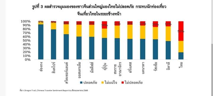 โดย 2 ปัจจัยที่มีผลต่อความสามารถในการแข่งขันด้านการท่องเที่ยวของไทย ได้แก่ ภาพลักษณ์ความปลอดภัยในสายตานักท่องเที่ยวบางกลุ่มลดลง ตั้งแต่ต้นปี 2568 หลายเหตุการณ์ได้ส่งผลกระทบต่อความเชื่อมั่นของนักท่องเที่ยวต่างชาติเที่ยวไทยและยังมีผลต่อเนื่อง โดยเฉพาะในกลุ่มนักท่องเที่ยวจีน จากผลสำรวจ ของ Dragon Trail ณ เดือนเมษายน 2568 พบว่า ชาวจีนมีความเชื่อมั่นด้านความปลอดภัยของประเทศไทยลดลงเหลือเพียง 19% ขณะที่ 51% มองว่าประเทศไทยมีความไม่ปลอดภัย