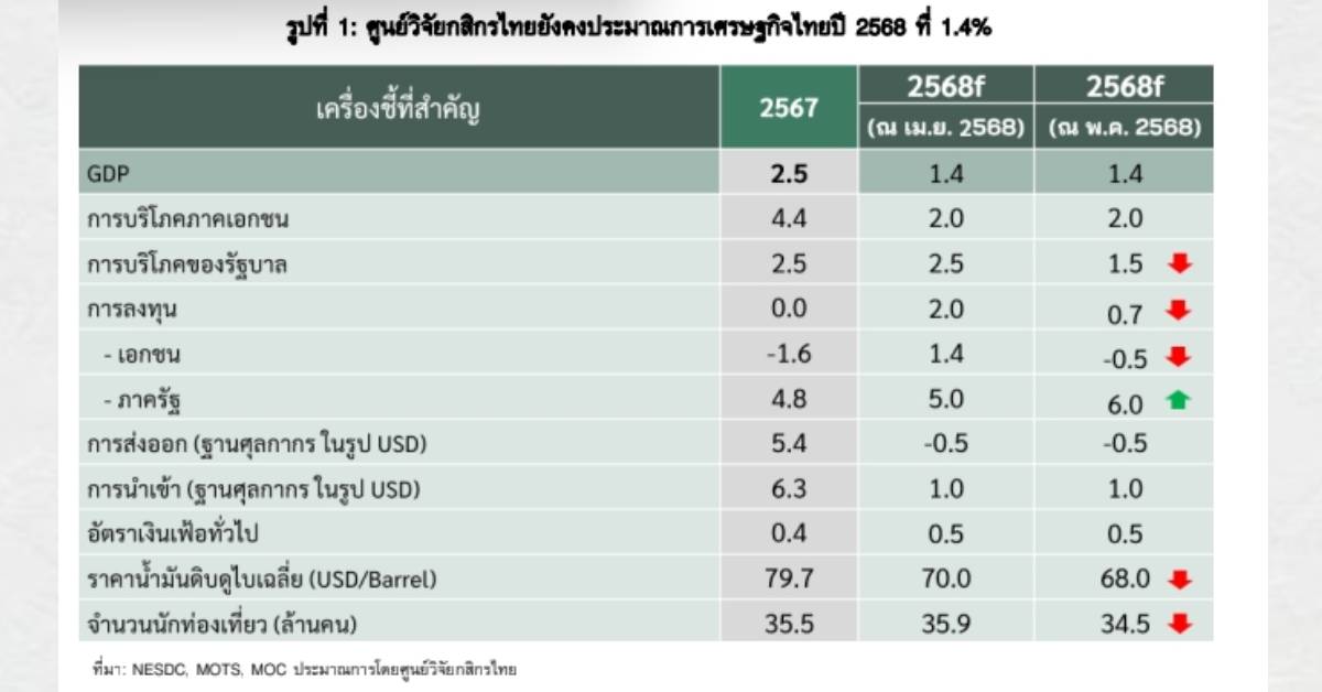 ในขณะที่ทิศทางเศรษฐกิจไทยในช่วงที่เหลือของปี 2568 ยังมีความไม่แน่นอนสูง แม้สหรัฐฯ จะเริ่มมีข้อตกลงทางการค้าออกมา โดยเฉพาะกับจีน แต่การบรรลุข้อตกลงกับไทยยังไม่มีกำหนดระยะเวลาที่ชัดเจน ในขณะที่แรงส่งจากท่องเที่ยวในปีนี้คาดว่าจะติดลบ ดังนั้น ศูนย์วิจัยกสิกรไทย จึงยังคงประมาณการเศรษฐกิจไทยปี 2568 ไว้ที่ 1.4%