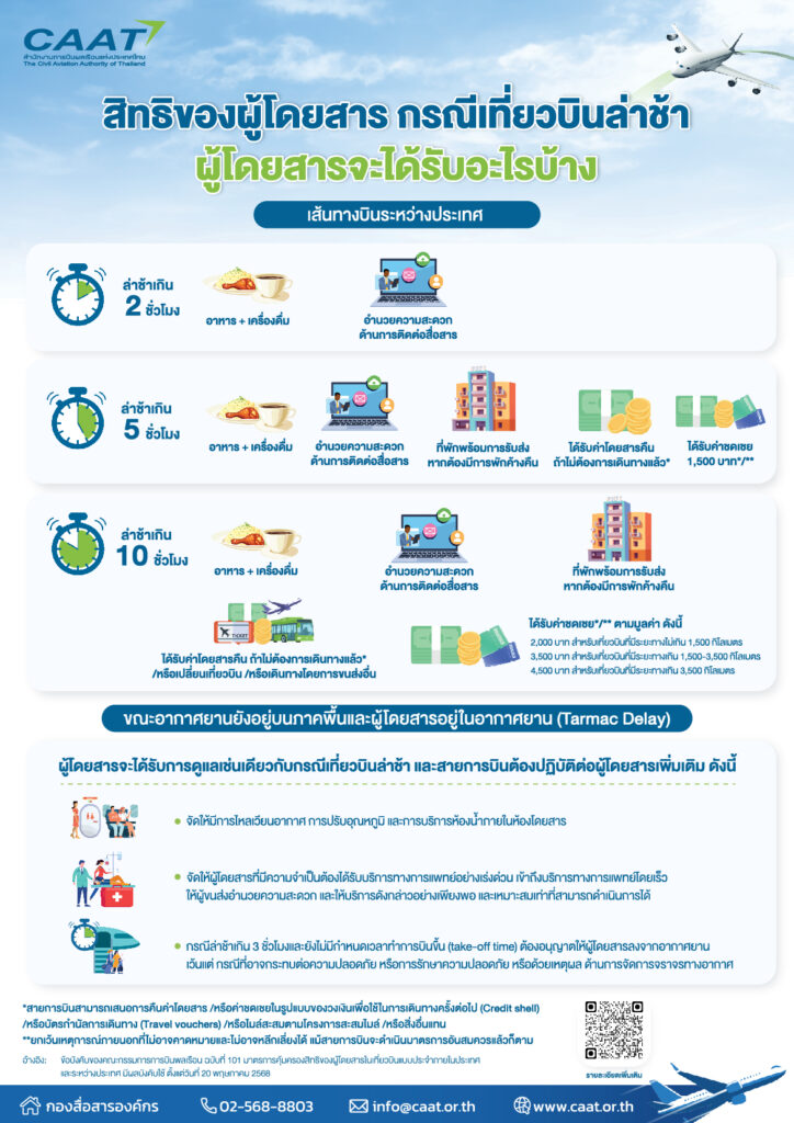 - กรณีเที่ยวบินล่าช้าขณะอากาศยานยังอยู่บนภาคพื้นและผู้โดยสารอยู่ในอากาศยาน (Tarmac Delay): ผู้โดยสารจะได้รับการดูแลจากสายการบิน รวมถึงการให้บริการพื้นฐานและสิทธิในการลงจากเครื่อง