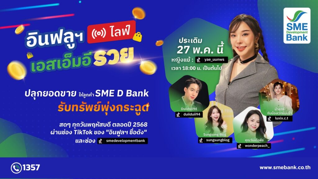 กรุงเทพฯ 21 พ.ค. – SME D Bank ผุดโครงการ “อินฟลูฯ ไลฟ์ เอสเอ็มอี รวย” ดึงคนดังบนโลกออนไลน์ช่วย Live Commerce ช่วยริวิวและขายสินค้า ตั้งเป้าปีนี้ช่วยเอสเอ็มอี 500 ราย