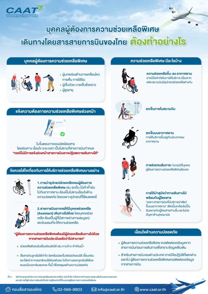 พล.อ.อ.มนัท ชวนะประยูร ผู้อำนวยการสำนักงานการบินพลเรือนแห่งประเทศไทย (CAAT) เปิดเผยว่าข้อกำหนดดังกล่าว เป็นไปเพื่อส่งเสริมให้บุคคลผู้ต้องการความช่วยเหลือพิเศษ ซึ่งเป็นผู้มีข้อจำกัดในการเข้าถึงการเดินทางทางอากาศ เช่น ผู้มีความบกพร่องด้านการเห็น การได้ยิน การเคลื่อนไหว การสื่อสาร หรือเป็นผู้มีอาการบาดเจ็บชั่วคราว รวมถึงผู้สูงอายุ ให้มีโอกาสได้เข้าถึงการเดินทางทางอากาศได้อย่างเท่าเทียม รวมทั้งยังเป็นการยกระดับมาตรฐานการให้บริการด้านขนส่งทางอากาศของประเทศไทยแก่กลุ่มบุคคลดังกล่าวให้เป็นไปตามมาตรฐานสากลตามที่องค์กรการบินพลเรือนระหว่างประเทศ (International Civil Aviation Organization – ICAO) กำหนดไว้เพื่อประโยชน์ในจัดเตรียมและประสานงานหน่วยงานที่เกี่ยวข้องในการให้บริการ บุคคลผู้ต้องการความช่วยเหลือพิเศษจะต้องทำการแจ้งล่วงหน้าถึงความต้องการใช้บริการความช่วยเหลือพิเศษต่าง ๆ ที่สนามบินและสายการบินมีไว้บริการ เช่น อุปกรณ์ช่วยเหลือขึ้น-ลงอากาศยาน รถเข็นภายในสนามบิน รถเข็นบนเครื่องบิน(การให้บริการขึ้นอยู่กับประเภทของอากาศยาน – Aircraft Type) การช่วยเหลือขนสัมภาระ ทั้งนี้ เงื่อนไขเกี่ยวกับช่องทางและกำหนดระยะเวลาแจ้งล่วงหน้าเป็นไปตามที่สายการบินแต่ละรายกำหนด