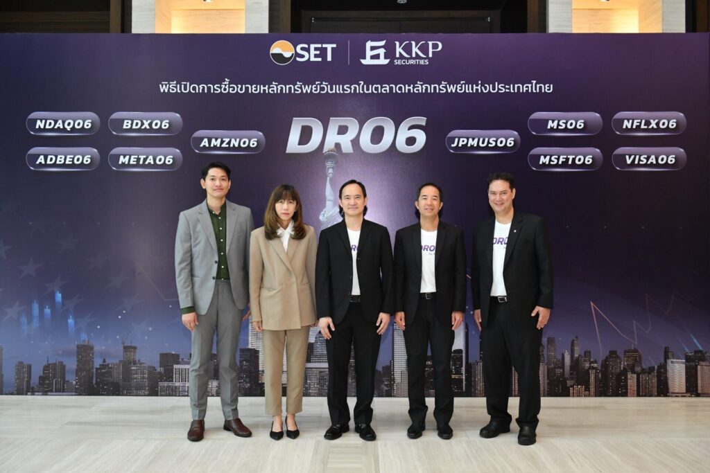 โดย DR ทั้ง 10 หลักทรัพย์ใหม่ ประกอบด้วย “ADBE06” อ้างอิงหุ้น Adobe Inc. บริษัทซอฟแวร์ชั้นนำให้บริการแก่ผู้สร้างเนื้อหาหรือผลิตภัณฑ์ด้านสื่อดิจิทัล “AMZN06” อ้างอิงหุ้น Amazon.com Inc. “BDX06” อ้างอิงหุ้น Becton Dickinson and Co บริษัทเทคโนโลยีทางการแพทย์ระดับโลก “JPMUS06” อ้างอิงหุ้น JPMorgan Chase & Co บริษัทบริการทางการเงินชั้นนำ “META06” อ้างอิงหุ้น Meta Platform Inc. “MS06” อ้างอิงหุ้น Morgan Stanley บริษัทที่ถือหุ้นธนาคารและให้บริการทางการเงินที่หลากหลายทั่วโลก “MSFT06” อ้างอิงหุ้น Microsoft Corporation “NDAQ06” อ้างอิงหุ้น Nasdaq, Inc. หนึ่งในตลาดหลักทรัพย์ที่ใหญ่ที่สุดในโลกให้บริการซื้อขายหลักทรัพย์และธุรกิจที่เกี่ยวข้อง รวมถึงธุรกิจข้อมูลการลงทุน “NFLX06” อ้างอิงหุ้น Netflix, Inc. และ “VISA06” อ้างอิงหุ้น Visa Inc.