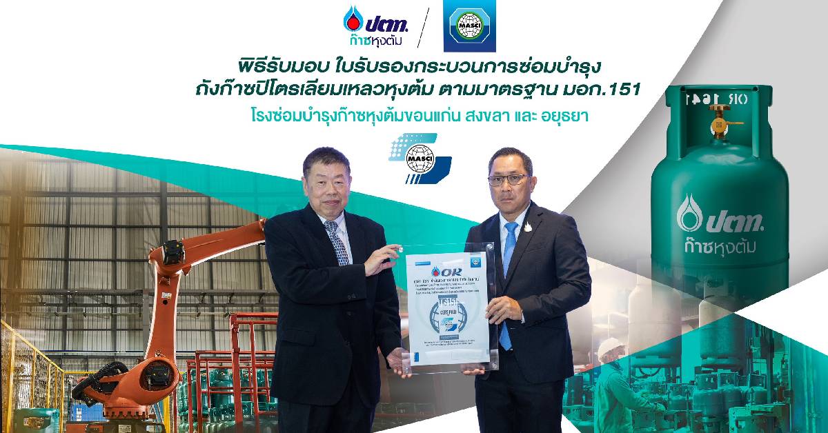 หม่อมหลวงปีกทอง ทองใหญ่ ประธานเจ้าหน้าที่บริหาร บริษัท ปตท. น้ำมันและการค้าปลีก จำกัด (มหาชน) หรือ OR รับมอบใบรับรองกระบวนการซ่อมบำรุงถังก๊าซปิโตรเลียมเหลวหุงต้ม ตามมาตรฐาน มอก.151 จาก นายจงรักษ์ โรจน์พลาเสถียร ผู้อำนวยการสถาบันรับรองมาตรฐานไอเอสโอ ตอกย้ำความมั่นใจให้ผู้บริโภคก๊าซหุงต้ม ปตท. ผ่านการยกระดับมาตรฐานด้านความปลอดภัยอย่างต่อเนื่อง โดยโรงซ่อมถังก๊าซหุงต้ม ปตท. ทั้ง 3 แห่ง ได้แก่ โรงซ่อมถังก๊าซหุงต้ม ปตท. จ.พระนครศรีอยุธยา สงขลา และ ขอนแก่น ผ่านการรับรองกระบวนการซ่อมบำรุงถังก๊าซปิโตรเลียมเหลวหุงต้ม ตามมาตรฐาน มอก.151 ซึ่งเป็นมาตรฐานกระบวนการซ่อมบำรุง การตรวจสอบ และการทดสอบถังก๊าซปิโตรเลียมเหลวหุงต้มที่มีการกำหนดมาตรฐานหลักเกณ์ วิธีการ และ เครื่องมือที่ใช้การดำเนินการ ซึ่งกำหนดโดยสำนักงานมาตรฐานผลิตภัณฑ์อุตสาหกรรม (สมอ.) กระทรวงอุตสาหกรรม ถือเป็นบริษัทแรกของประเทศไทยที่ผ่านการรับรองในกระบวนการนี้