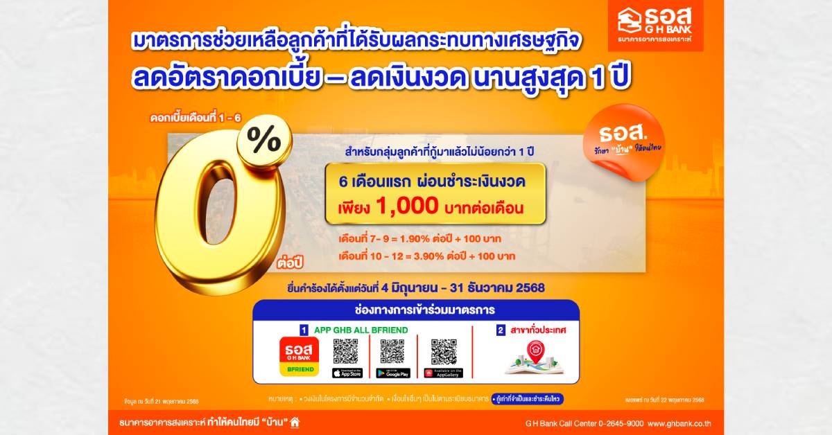 กรุงเทพฯ 22 พ.ค. – ธอส. ช่วยเหลือลูกค้า SM ลดดอกเบี้ย- เงินงวด นานสูงสุด 1 ปี ผู้ สนใจสามารถลงทะเบียนผ่าน GHB ALL BFRIEND และสาขาทั่วประเทศ เริ่ม 4 มิ.ย.-31 ธ.ค.68
