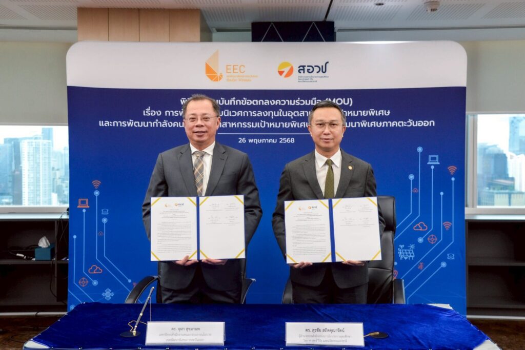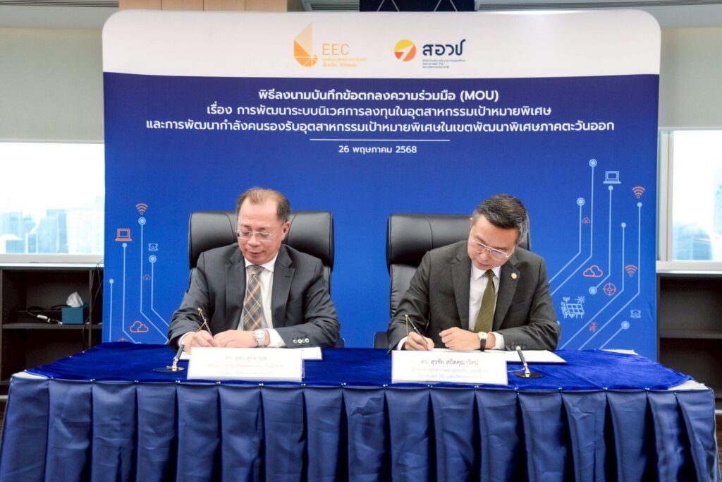 ดร. จุฬา สุขมานพ เลขาธิการคณะกรรมการนโยบายเขตพัฒนาพิเศษภาคตะวันออก (สกพอ.) หรืออีอีซี และ ดร. สุรชัย สถิตคุณารัตน์ ผู้อำนวยการสำนักงานสภานโยบายการอุดมศึกษา วิทยาศาสตร์ วิจัยและนวัตกรรมแห่งชาติ (สอวช.) ร่วมกันลงนามบันทึกข้อตกลง (MOU) เรื่อง การพัฒนาระบบนิเวศการลงทุนในอุตสาหกรรมเป้าหมายพิเศษและการพัฒนากำลังคนรองรับอุตสาหกรรมเป้าหมายพิเศษในเขตพัฒนาพิเศษภาคตะวันออก ระหว่าง สกพอ. และ สอวช. เพื่อร่วมกันติดตามสถานการณ์ของเทคโนโลยีในอุตสาหกรรมเป้าหมายพิเศษในเขตพัฒนาพิเศษภาคตะวันออก หรือ พื้นที่อีอีซี พร้อมกับสนับสนุนการลงทุนด้านเทคโนโลยีขั้นสูง ผ่านการขับเคลื่อนนโยบายด้านวิทยาศาสตร์ เทคโนโลยี และนวัตกรรม และยกระดับเครือข่ายด้านการวิจัยและพัฒนาในประเทศ