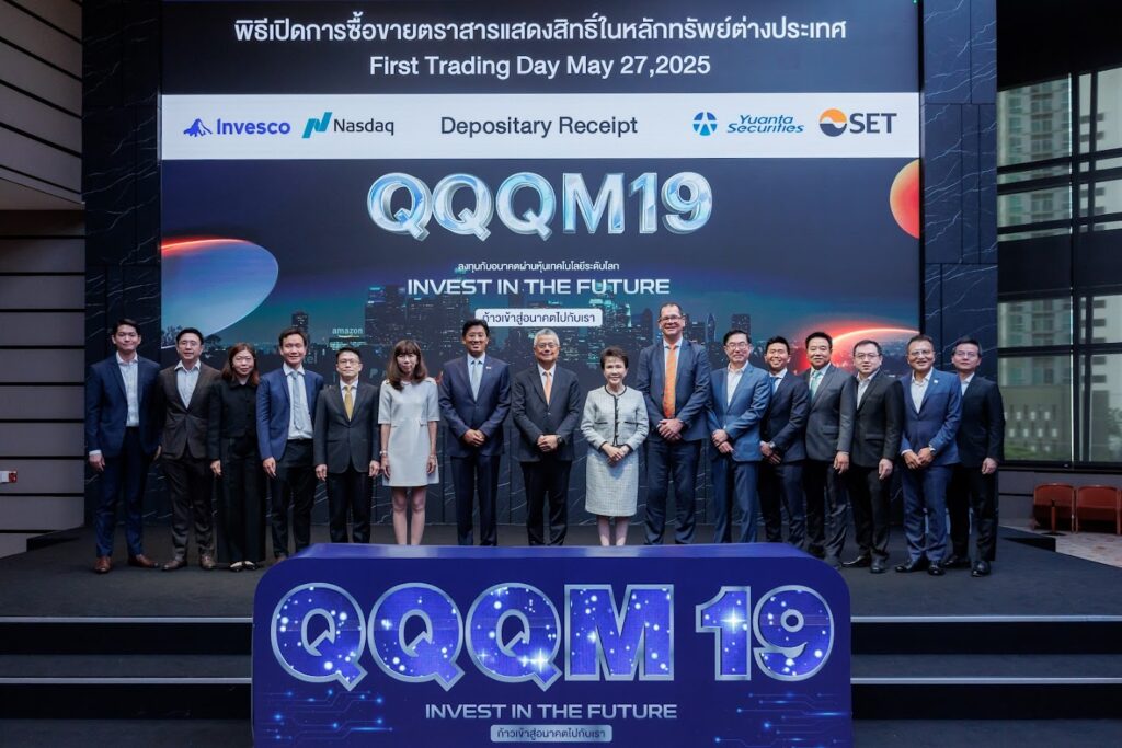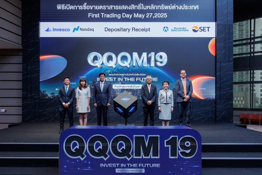 นายอัสสเดช คงสิริ กรรมการและผู้จัดการ ตลาดหลักทรัพย์แห่งประเทศไทย, นางบุญพร บริบูรณ์ส่งศิลป์ ประธานเจ้าหน้าที่บริหาร บริษัทหลักทรัพย์ หยวนต้า (ประเทศไทย) จำกัด, Mr.Marty Franc Chief Executive Officer (CEO), Apac ex. JP Invesco ร่วมพิธีเปิดการซื้อขาย หลักทรัพย์วันแรกในตลาดหลักทรัพย์แห่งประเทศไทย (set) ของตราสารแสดงสิทธิ์ในหลักทรัพย์ต่างประเทศ (Depositary Receipt: DR) “QQQM19” ที่อ้างอิงกองทุนรวมดัชนี (Exchange Traded Fund – ETF) ที่บริหารจัดการโดย Invesco ภายใต้ชื่อหลักทรัพย์ “QQQM” เพิ่มทางเลือกการลงทุนที่หลากหลายและเข้าถึงง่ายสำหรับนักลงทุนไทย โดยเฉพาะนักลงทุนรายย่อย ที่ต้องการลงทุนในกลุ่มหุ้นเทคโนโลยีและหุ้นเติบโตชั้นนำของสหรัฐอเมริกาโดยที่นักลงทุนสามารถดำเนินการซื้อขาย QQQM19 บนบัญชีหุ้นไทยได้เลยและไม่จำเป็นต้องเปิดบัญชีซื้อขายหลักทรัพย์ต่างประเทศหรือโยกย้ายสินทรัพย์ไปต่างประเทศ