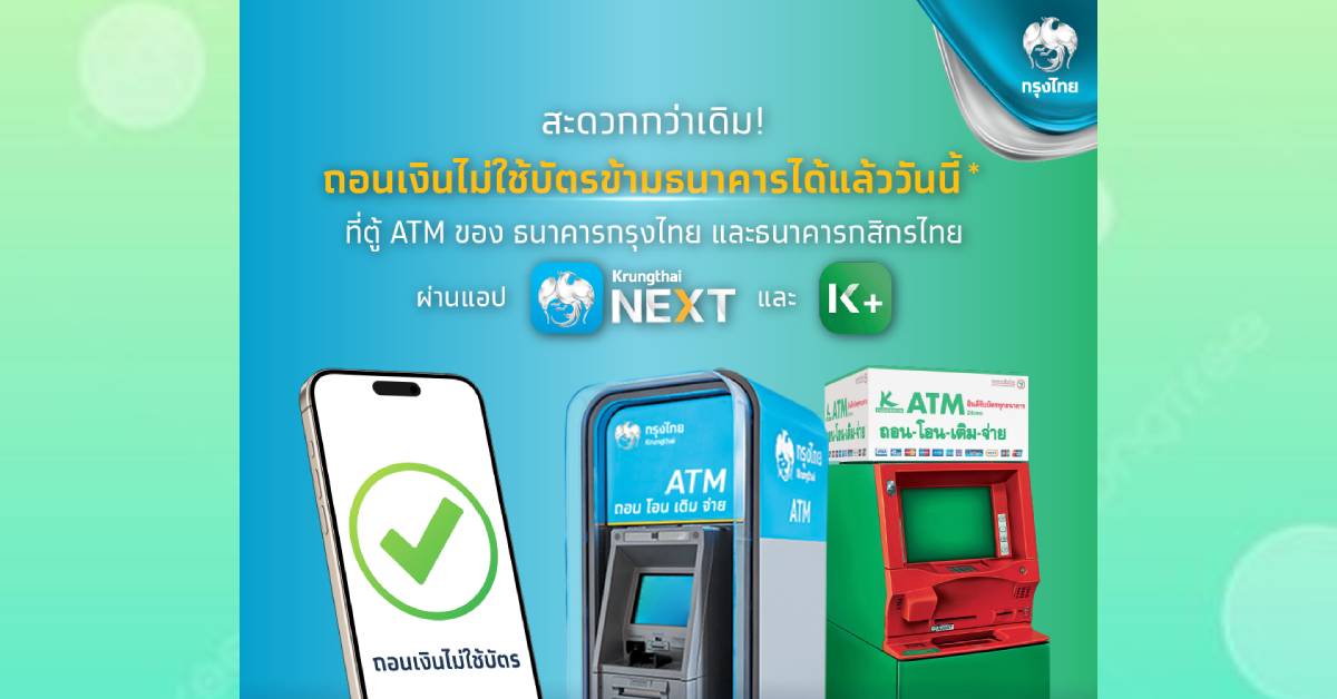 ธนาคารกรุงไทย เพิ่มช่องทางอำนวยความสะดวกให้ลูกค้า ด้วย บริการถอนเงินไม่ใช้บัตรแบบข้ามธนาคาร (Cross Bank Cardless ATM Withdrawal) สามารถถอนเงินไม่ใช้บัตร ผ่านแอปพลิเคชัน Krungthai NEXT และ K PLUS ได้ทั้งตู้ ATM/CDM ของธนาคารกรุงไทย และธนาคารกสิกรไทย จำนวนรวมกว่า 16,000 ตู้ทั่วประเทศ ตั้งแต่วันนี้เป็นต้นไป โดยลูกค้าธนาคารกรุงไทยสามารถใช้บริการถอนเงินไม่ใช้บัตร โดยไม่เสียค่าธรรมเนียม เมื่อทำรายการถอนเงินที่ตู้ ATM ของธนาคารกรุงไทย ทั่วประเทศ