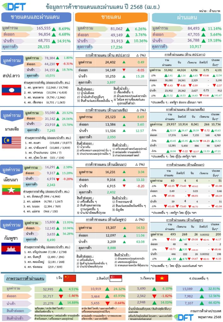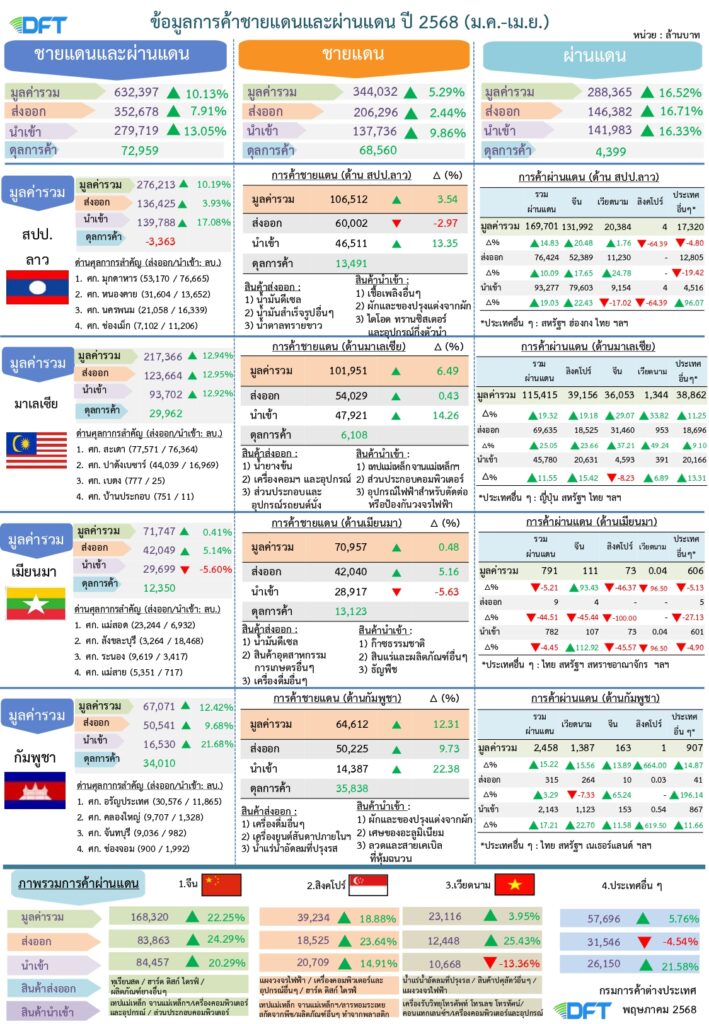 นางอารดา เฟื่องทอง อธิบดีกรมการค้าต่างประเทศ เปิดเผยตัวเลขการค้าชายแดนและการค้าผ่านแดน เดือนเมษายน 2568 มีมูลค่าการค้ารวม 165,555 ล้านบาท ขยายตัว 8.7% เมื่อเทียบกับช่วงเดียวกันของปีก่อน เป็นการส่งออก 96,854 ล้านบาท (+4.7%) และการนำเข้า 68,701 ล้านบาท (+14.9%) โดยไทยได้ดุลการค้าในเดือนเมษายน 2568 ทั้งสิ้น 28,153 ล้านบาท ส่งผลให้ 4 เดือนแรกของปี 2568 การค้าชายแดนและการค้าผ่านแดนมีมูลค่าการค้ารวม 632,397 ล้านบาท (+10.7%) เป็นการส่งออก 352,678 ล้านบาท (+7.9%) การนำเข้า 279,719 ล้านบาท (+13.1%) และไทยได้ดุลการค้า 72,959 ล้านบาท โดยการค้าชายแดนกับ มาเลเซีย มีมูลค่าสูงสุด 25,123 ล้านบาท (+8.7%) รองลงมา คือ สปป.ลาว 24,402 ล้านบาท (+0.5%) เมียนมา 16,231 ล้านบาท (+3.0%) และกัมพูชา 15,307 ล้านบาท (+16.5%) สินค้าส่งออกชายแดนสำคัญในเดือนเมษายน 2568 ได้แก่ น้ำมันดีเซล 3,140 ล้านบาท น้ำมันสำเร็จรูปอื่น ๆ 1,474 ล้านบาท และเครื่องดื่มอื่น ๆ (เช่น นม UHT นมถั่วเหลือง) 1,362 ล้านบาท