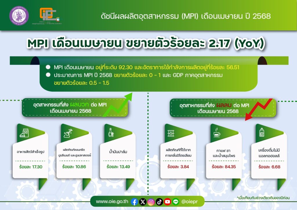 กรุงเทพฯ 30 พ.ค. – สำนักงานเศรษฐกิจอุตสาหกรรม (สศอ.) เผยดัชนีผลผลิตอุตสาหกรรม (MPI) เดือนเมษายน 2568 อยู่ที่ระดับ 92.30 ขยายตัวร้อยละ 2.17 จากช่วงเดียวกันของปีก่อน โดยได้แรงหนุนจากการฟื้นตัวของอุตสาหกรรมยานยนต์เป็นครั้งแรกในรอบ 21 เดือน และมาตรการกระตุ้นเศรษฐกิจภาครัฐ พร้อมปรับประมาณการ MPI ปี 2568 ขยายตัวร้อยละ 0 – 1 ขณะที่ GDP ภาคอุตสาหกรรมคาดขยายตัวร้อยละ 0.5-1.5