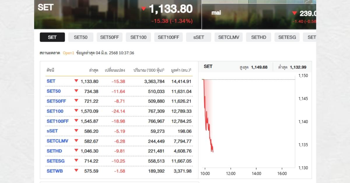 ผู้สื่อข่าวรายงานว่า เช้านี้หุ้นไทยร่วงแรง เมื่อเวลา 10.37 น. ร่วงกว่า 15 จุด ดัชนีเคลื่อนไหวที่ 1,133 จุด ถูกกดดันจากแรงขายหุ้น DELTA ประกอบกับนักลงทุนต่างชาติยังมีแรงขายต่อเนื่อง CPALL เป็นโมเมนตัมลบต่อเนื่องจากการปรับ MSCI เมื่อวันศุกร์ ในขณะที่หุ้นเอเชียเปิดบวกในวันนี้ (4 มิ.ย.) ตามทิศทางตลาดหุ้นนิวยอร์กที่ปิดพุ่งขึ้นกว่า 200 จุด ในวันอังคาร (3 มิ.ย.) แรงหนุนจากหุ้นบริษัทผลิตชิป ซึ่งรวมถึงหุ้นอินวิเดีย (Nvidia)