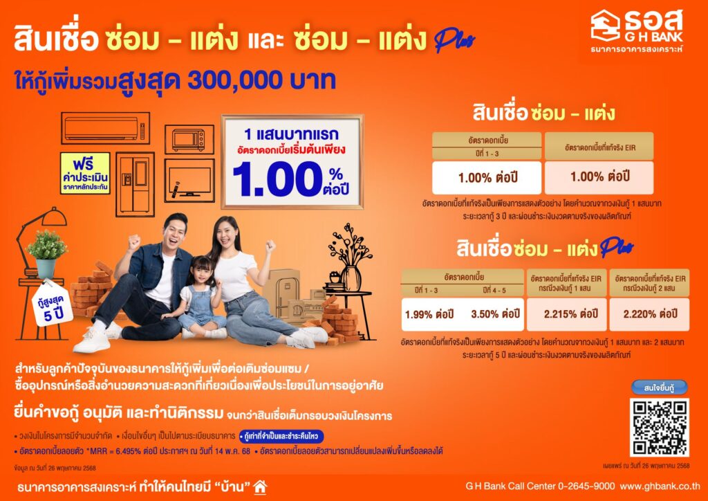 (3) สินเชื่อซ่อม – แต่ง และสินเชื่อซ่อม – แต่ง Plus : เพิ่มเม็ดเงินลงสู่ระบบเศรษฐกิจ เพื่อส่งผลบวกต่อเศรษฐกิจในระยะสั้น โดยลูกค้าปัจจุบันของ ธอส. ที่มีการผ่อนชำระหนี้เงินกู้กับธนาคารมาแล้วไม่น้อยกว่า 2 ปี และมีประวัติการผ่อนชำระที่ดีสม่ำเสมอทุกเดือนไม่น้อยกว่า 12 เดือน กรอบวงเงินรวม 10,000 ล้านบาท ให้กู้เพิ่มรวมวงเงินสูงสุดไม่เกิน 300,000 บาท / ราย โดยวงเงิน 100,000 บาทแรก อัตราดอกเบี้ยเริ่มต้นเพียง 1.00% ต่อปี และอีก 200,000 บาท อัตราดอกเบี้ย ปีที่ 1 – 3เท่ากับ 1.99% ต่อปี และปีที่ 4 – 5 เท่ากับ 3.50%ต่อปี สำหรับลูกค้าปัจจุบันของธนาคารที่ต้องการกู้เพิ่มเพื่อปรับปรุง ต่อเติม หรือซื้ออุปกรณ์และสิ่งอำนวยความสะดวกที่เกี่ยวเนื่องเพื่อประโยชน์ในการอยู่อาศัย อาทิ รีโนเวทบ้านใหม่ เปลี่ยนเฟอร์นิเจอร์และเครื่องใช้ไฟฟ้าใหม่ หรือติดตั้ง Solar Roof ยื่นกู้ง่าย ๆ โดยไม่ต้องจดทะเบียนการจำนองเพิ่มที่สำนักงานที่ดิน