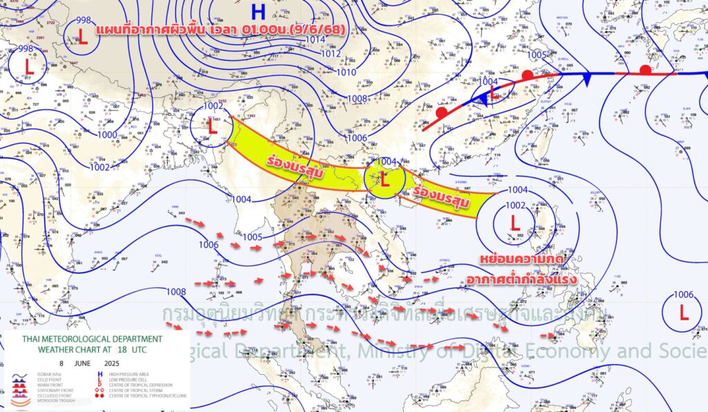 จากนั้น ตั้งแต่วันพรุ่งนี้ (10 มิ.ย. 68) ถึงวันที่ 12 มิ.ย. ร่องมรสุมกำลังปานกลางจะเลื่อนลงมาพาดผ่านภาคเหนือ ภาคตะวันออกเฉียงเหนือ และภาคกลางตอนบน เข้าสู่หย่อมความกดอากาศต่ำบริเวณทะเลจีนใต้ตอนกลาง ประกอบกับมรสุมตะวันตกเฉียงใต้ที่พัดปกคลุมภาคกลางตอนล่าง ภาคใต้ ภาคตะวันออก และอ่าวไทย จะมีกำลังแรงขึ้น ทำให้ประเทศไทยมีฝนเพิ่มขึ้นต่อเนื่อง และมีฝนตกหนักถึงหนักมากบางแห่ง