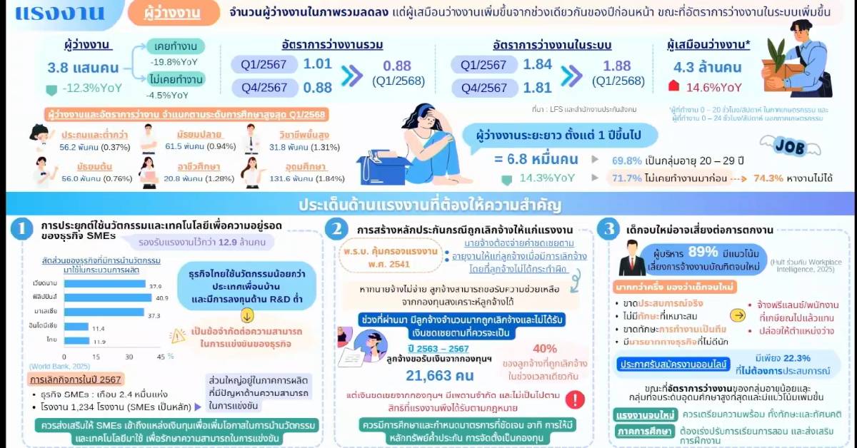 สำหรับตัวเลขผู้มีงานทำอยู่ที่ 39.4 ล้านน โดยเฉพาะภาคเกษตรกรรมมีการจ้างงานลดลงต่อเนื่อง ส่วนนอกภาคเกษตรขยายตัวได้เล็กน้อย โดยเฉพาะสาขาโรงแรมและภัตตาคารยังคงขยายตัวได้ที่ 3.5% แม้จำนวนนักท่องเที่ยวต่างชาติจะเริ่มลดลง เช่นเดียวกับสาขาการขนส่งและเก็บสินค้าที่ขยายตัวต่อเนื่อง 4.5% ขณะที่การจ้างงานในสาขาการผลิตเริ่มหดตัวลงเล็กน้อยที่ 0.4% ส่วนเด็กจบใหม่อาจเสี่ยงตกงาน โดยพบว่ามีสัดส่วนผู้ว่างงานในกลุ่มที่อุดมศึกษาสูงถึง 131,600 คน หรือ 1.84% ซึ่งถือว่าสูงที่สุดในทุกระดับการศึกษา ขณะเดียวกันจำนวนแรงงานที่อยู่ในภาวะการทำงานต่ำกว่าศักยภาพ (Underemployment) มีแนวโน้มเพิ่มขึ้น โดยเฉพาะในภาคการค้าและบริการ สะท้อนถึงผลกระทบจากภาวะเศรษฐกิจที่ยังคงชะลอตัว ผู้ประกอบการไทยเกิดปัญหาด้านการแข่งขันและมีผลต่อกลุ่มธุรกิจขนาดกลางและขนาดย่อม (SMEs) อย่างชัดเจน โดยในช่วงที่ผ่านมา มี SMEs ปิดกิจการกว่า 24,000 แห่ง และโรงงานอีก 1,234 แห่ง