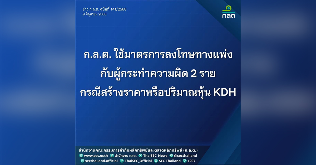 กรุงเทพฯ 9 มิ.ย. – ก.ล.ต. ดำเนินคดีด้วยมาตรการลงโทษทางแพ่งกับผู้กระทำความผิด 2 ราย ได้แก่ นางวัลลีย์ สังข์ศิริ และนางสาวสุนิช์ศา ชุตินธร กรณีสร้างราคาหรือปริมาณหุ้นบริษัท ธนบุรี เมดิเคิล เซ็นเตอร์ จำกัด (มหาชน) (KDH) โดยเรียกให้ชำระค่าปรับทางแพ่งรวม 17,215,750 บาท