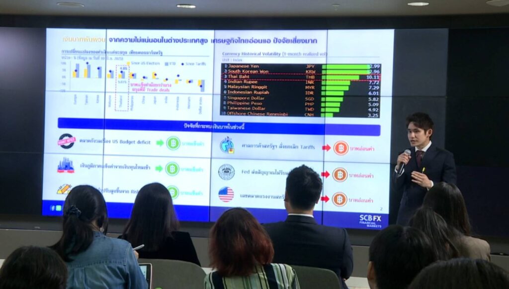 กรุงทพฯ 11 มิ.ย. – SCB ชี้เงินบาทยังผันผวนสูง จากมาตรการภาษีนำเข้าสหรัฐที่ยังไม่แน่นอน และเงินทุนเคลื่อนย้ายจากสหรัฐเข้ายุโรป-เอเชีย ส่วนไทยไหลเข้าตลาดพันธบัตรมากกว่า ประเมินสิ้นปีเงินบาทแข็งค่าขึ้นในกรอบ 31.50-32.50 บาท/ดอลลาร์ คาดปีนี้ กนง.ปรับลดดอกเบี้ยอีก 2 ครั้ง