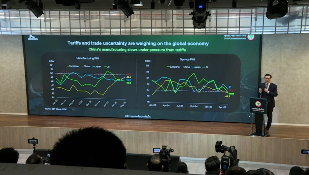 สำหรับมาตรการภาษีนำเข้าของสหรัฐฯ ที่จะสิ้นสุดการชะลอลงในวันที่ 9 กรกฎาคม 2568 ยังมีความไม่แน่นอนสูง มองว่า ขณะนี้การเจรจาของไทยยังไม่คืบหน้า เมื่อเทียบกับประเทศอื่นๆ ทำให้ศูนย์วิจัยกสิกรไทยมองเศรษฐกิจไทยยังคงเติบโตที่ 1.4% และเศรษฐกิจไทยในช่วงครึ่งหลังของปี 2568 ยังมีความเสี่ยงที่จะเกิดภาวะถดถอยทางเทคนิค อย่างไรก็ตาม หากอัตราภาษีนำเข้าสหรัฐฯ ในหลายประเทศยังคงไว้ที่ระดับ 10% ตลอดทั้งปี คาดว่าการส่งออกไทยจะขยายตัวได้ที่ 0.5% และเศรษฐกิจไทยจะมีแนวโน้มเติบโตได้ 1.8% แต่ถ้าหากไทยถูกเรียกเก็บภาษีในอัตรา 36% จะส่งผลต่อการส่งออกในไตรมาสที่ 3 และไตรมาสที่ 4 ติดลบ รวมถึงจีดีพีอาจจะหดตัวมากกว่าที่คาดการณ์ไว้
