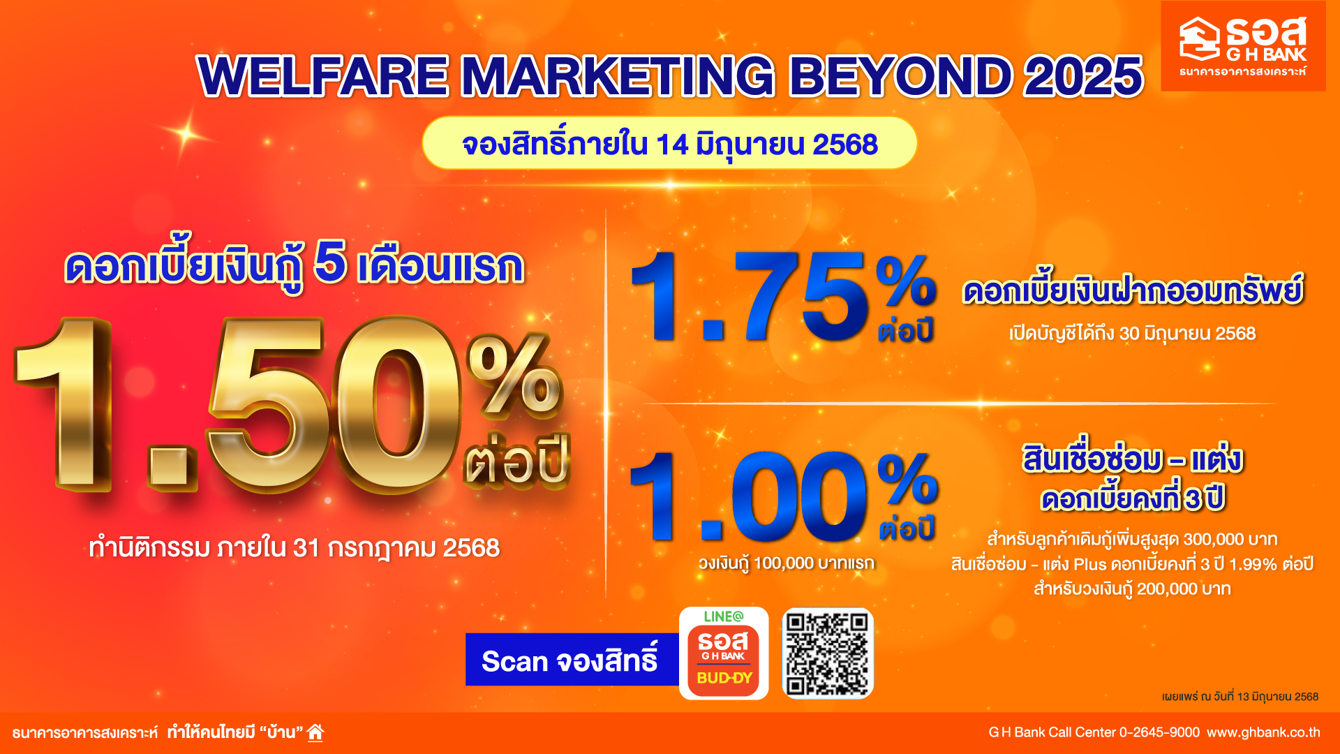 ธนาคารอาคารสงเคราะห์ (ธอส.) ย้ำความสำเร็จงาน “มหกรรมทางการเงินออนไลน์ : Welfare Marketing Beyond 2025” สะท้อนประสิทธิภาพการให้บริการด้านออนไลน์ของธนาคาร หลังได้รับกระแสตอบรับมีผู้สนใจเข้าร่วมงานผ่าน Live Streaming ช่องทาง Facebook Fanpage ธนาคารอาคารสงเคราะห์ และจองสิทธิ์โปรโมชันพิเศษเป็นจำนวนมาก ทั้งสินเชื่อบ้านดอกเบี้ยพิเศษ อัตราดอกเบี้ยคงที่ 5 เดือนแรก 1.50% ต่อปี, สินเชื่อซ่อม-แต่ง ดอกเบี้ยเริ่มต้น 1% ต่อปี และเงินฝากดอกเบี้ยสูง 1.75% ต่อปี สามารถจองสิทธิ์โปรโมชันงาน Welfare Marketing Beyond 2025 วันที่ 14 มิถุนายน 2568 ผ่าน Line GHB Buddy