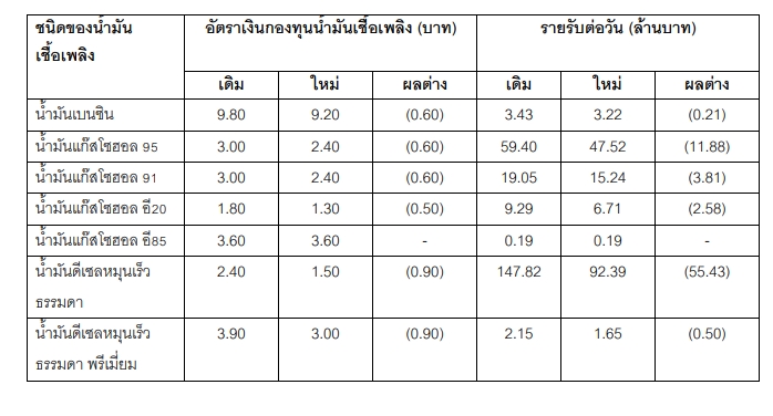 นายพรชัย จิรกุลไพศาล ผู้อำนวยการสำนักนโยบายและแผน สำนักงานกองทุนน้ำมันเชื้อเพลิง (สกนช.) เปิดเผยว่า การปรับลดอัตราเงินส่งเข้ากองทุนน้ำมันฯ ดังกล่าว จะทำให้รายรับของกองทุนน้ำมันเชื้อเพลิงประเภทน้ำมันทุกชนิด (รวมถึงน้ำมันเตา) ลดลงประมาณวันละ 74.41 ล้านบาท จากเดิมที่มีรายรับประมาณวันละ 241.64 ล้านบาท เหลือประมาณวันละ 167.23 ล้านบาท โดยปัจจุบันฐานะกองทุนน้ำมันเชื้อเพลิง ณ วันที่ 15 มิถุนายน 2568 ติดลบอยู่ที่ 36,268 ล้านบาท แบ่งเป็น บัญชีน้ำมันบวกอยู่ที่ 8,244 ล้านบาท และบัญชี LPG ติดลบอยู่ที่ 44,512 ล้านบาท