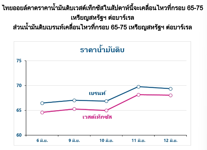 ด้าน บมจ.ไทยออยล์ คาดราคาน้ำมันดิบเวสต์เท็กซัสในสัปดาห์นี้ (13-19 มิ.ย.68) จะเคลื่อนไหวที่กรอบ 65-75 เหรียญสหรัฐฯ ต่อบาร์เรล ส่วนน้ำมันดิบเบรนท์เคลื่อนไหวที่กรอบ 65-75 เหรียญสหรัฐฯ ต่อบาร์เรล โดยราคาน้ำมันดิบมีแนวโน้มปรับเพิ่มขึ้นจากสถานการณ์ความขัดแย้งทางภูมิรัฐศาสตร์ในตะวันออกกลาง และการเจรจานิวเคลียร์ระหว่างอิหร่านและสหรัฐฯ ที่ยังมีความไม่แน่นอน ในขณะที่กลุ่มโอเปกเพิ่มกำลังการผลิตต่ำกว่าที่ตลาดคาดใน เดือน พ.ค. 68 ที่ผ่านมา นอกจากนี้ ตลาดยังจับตาการประชุม G7 ที่จะมีการหารือเรื่องมาตรการคว่ำบาตรรัสเซียรอบใหม่ อย่างไรก็ตาม แนวโน้มเศรษฐกิจโลกยังถูกกดดันจากความไม่แน่นอนด้านภาษีสหรัฐฯ และการชะลอตัวของอุปสงค์น้ำมันโลก ขณะเดียวกันตลาดคาดเฟดยังคงตรึงอัตราดอกเบี้ยที่ระดับเดิมในการประชุมเดือน มิ.ย.68