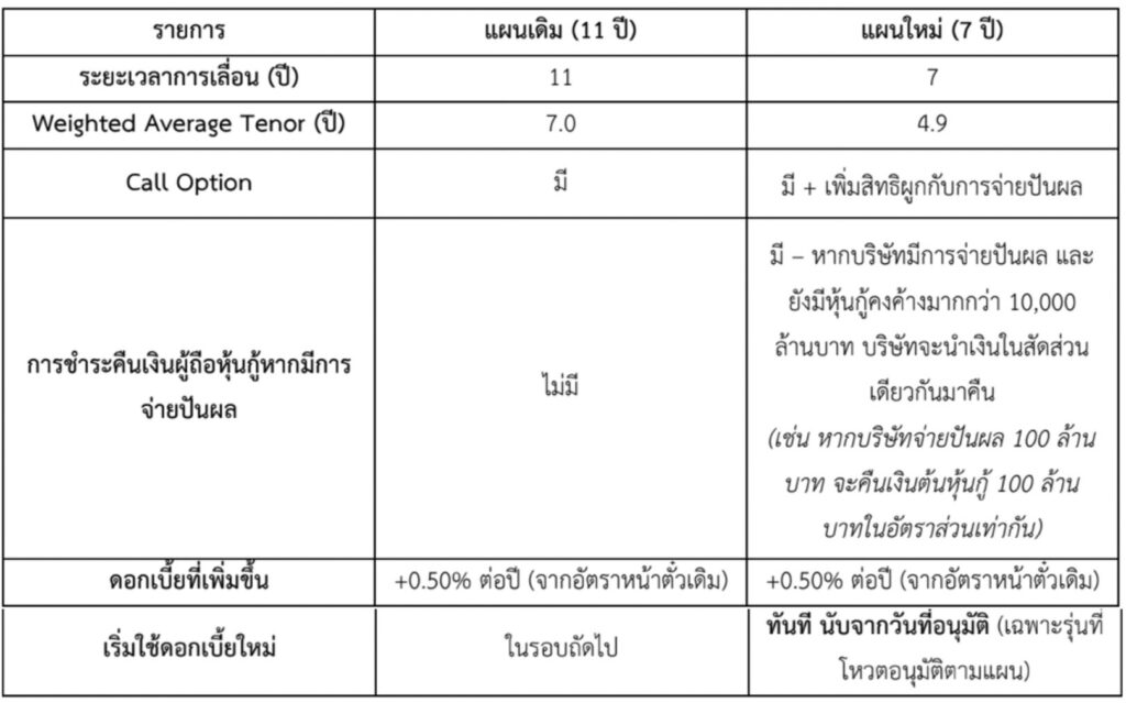 สรุปสิทธิประโยชน์ตามแผนใหม่ (สำหรับผู้ถือหุ้นกู้ในแต่ละรุ่นที่อนุมัติ)