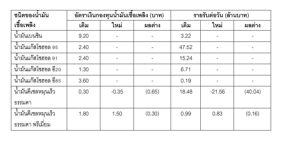 ทั้งนี้ นับเป็นครั้งที่ 4 ในรอบสัปดาห์ ที่ กบน.มีมติปรับลดอัตราเก็บเงินกองทุนน้ำมันฯ โดยใช้เงินช่วยพยุงราคาน้ำมันดีเซล เพื่อรักษาระดับราคาน้ำมันดีเซลไม่ให้ปรับขึ้น ซึ่งจากมาตรการล่าสุด ส่งผลให้รายรับของกองทุนน้ำมันเชื้อเพลิงประเภทน้ำมันดีเซล ปัจจุบันกลับมาติดลบ อยู่ที่วันละ 20.73 ล้านบาท ขณะที่รายรับจากกลุ่มน้ำมันเบนซิน ยังคงอยู่ที่ประมาณวันละ 72.88 ล้านบาทเท่าเดิม (รายละเอียดอยู่ในตาราง)