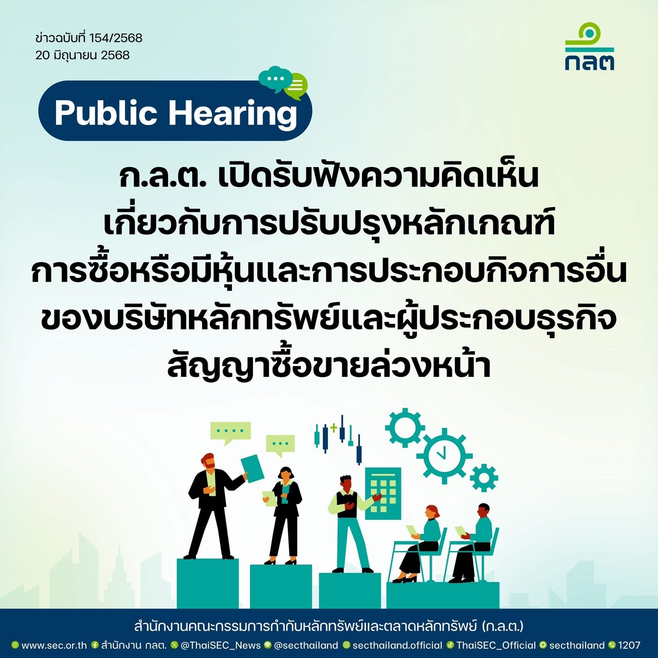 ก.ล.ต. ได้เผยแพร่เอกสารรับฟังความคิดเห็นซึ่งมีรายละเอียดการปรับปรุงหลักการและร่างประกาศในเรื่องดังกล่าวบนเว็บไซต์ ก.ล.ต. https://www.sec.or.th/TH/Pages/PB_Detail.aspx?SECID=1085 และระบบกลางทางกฎหมาย https://www.law.go.th/listeningDetail?survey_id=NTQ3NkRHQV9MQVdfRlJPTlRFTkQ= ผู้ที่เกี่ยวข้องและผู้สนใจสามารถศึกษาและแสดงความคิดเห็นได้ผ่านช่องทางเว็บไซต์หรือทาง e-mail : phachisa@sec.or.th chawannuch@sec.or.th หรือ laksika@sec.or.th จนถึงวันที่ 5 กรกฎาคม 2568.-516 สำนักข่าวไทย