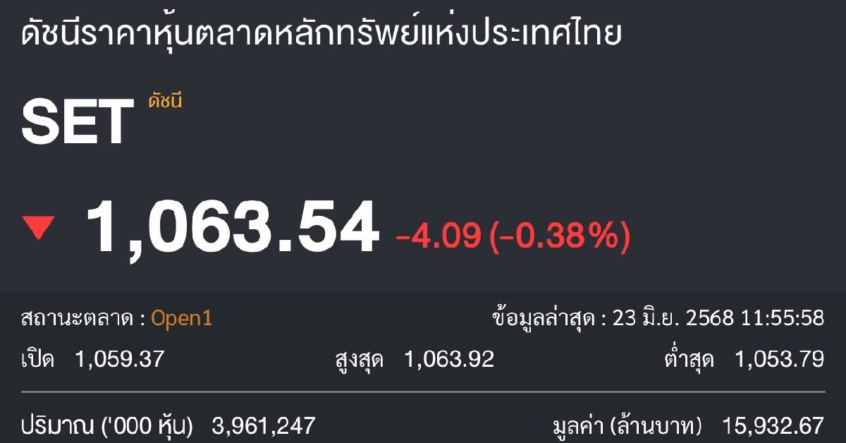 ผู้สื่อข่าวรายงานภาวะหุ้นไทยวันนี้ เปิดตลาดภาคเช้าวันที่ 23 มิ.ย.68 ที่ระดับ 1,059.37 จุด ลดลง 8.26 จุด โดยล่าสุดเวลา 11.50 น. ดัชนีหุ้นไทยอยู่ที่ 1,063.54 ลดลง 4.09 จุด หรือ 0.38 % มูลค่าซื้อขาย 15,932.67 ล้านบาท ดัชนีสูงสุด 1,062.54 จุด ต่ำสุด 1,053.79 จุด ลดลง 11.35 จุด