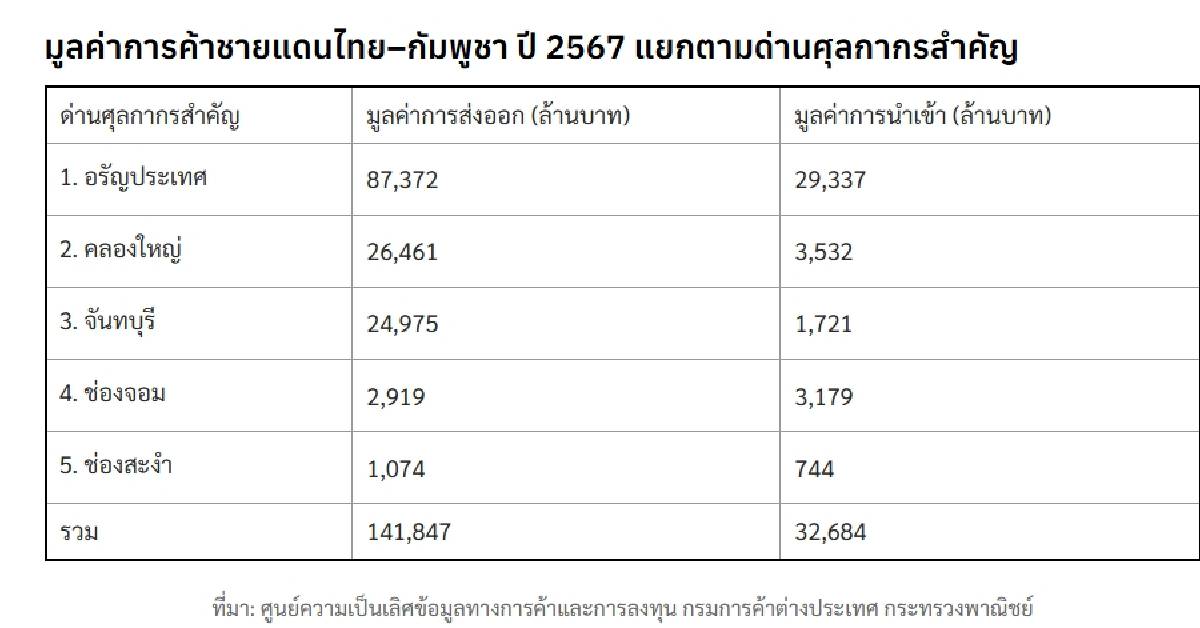 ส่วนสถิติการค้าชายแดนไทย-กัมพูชา ปี 2567 พบว่ามีมูลค่าการค้ารวม 175,530 ล้านบาท แบ่งเป็นการส่งออกมูลค่า 141,846 ล้านบาท การนำเข้ามูลค่า 32,684 ล้านบาท ได้ดุลการค้า 109,163 ล้านบาท. -511-สำนักข่าวไทย