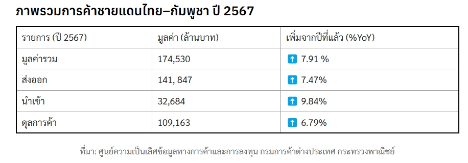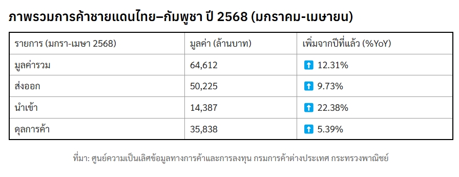 สำหรับการค้าชายแดนไทย-กัมพูชา ปี 2568 (ม.ค-เม.ย) มีมูลค่ารวม 64,612 ล้านบาท เพิ่มจากปีก่อนร้อยละ 12.31 โดยแบ่งเป็นมูลค่าการส่งออก 50,225 ล้านบาท เพิ่มขึ้นร้อยละ 9.73 และมูลค่าการนำเข้า 14,387 ล้านบาท เพิ่มขึ้นร้อยละ 22.38 โดยไทยยังคงเป็นฝ่ายเกินดุลการค้า 35,838 ล้านบาท ซึ่งเป็นตัวเลขเกินดุลการค้าที่เพิ่มขึ้นจากช่วงเวลาเดียวกันในปีก่อนร้อยละ 5.39