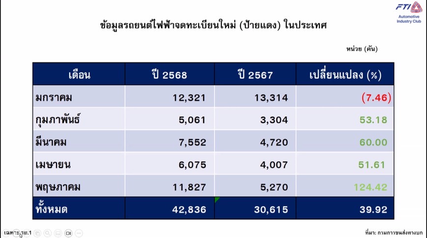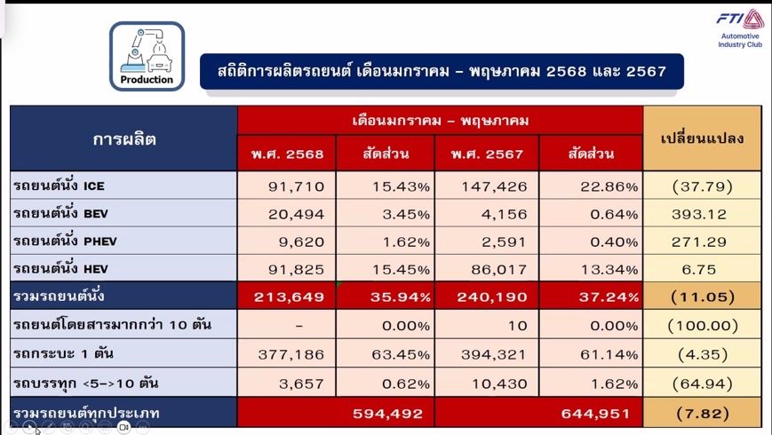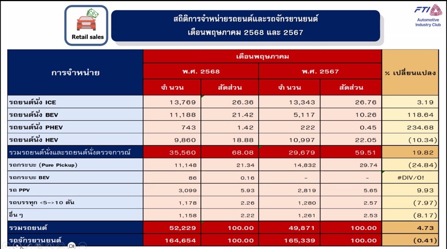 “ในส่วนของยานยนต์ไฟฟ้าจดทะเบียนสะสมประเภท BEV 5 เดือน อยู่ที่ 53,955 คัน เพราะค่ายรถเร่งผลิตชดเชยตามมาตรการที่ EV3.0 และ 3.5 ซึ่งคาดว่าปีนี้จะทะลุ 1 แสนคัน แต่ทั้งนี้ก็ยังมีปัจจัยที่ต้องจับตาไม่ว่าจะเป็นการผ่านงบประมาณปี 69 ความขัดแย้งชายแดนไทย-กัมพูชา รวมถึงความขัดแย้งระหว่างประเทศต่างๆ เนื่องจากมีผลต่อเศรษฐกิจ และยังต้องจับตาการเจรจาภาษี Reciprocal Tariffs กับสหรัฐว่าจะลดภาษีลงจาก 36% หรือไม่ และต้องเทียบกับประเทศเพื่อนบ้านด้วย หากภาษีที่เรียกเก็บกับเราน้อยกว่าก็ถือว่าเรายังได้เปรียบ” นายสุรพงษ์ กล่าว