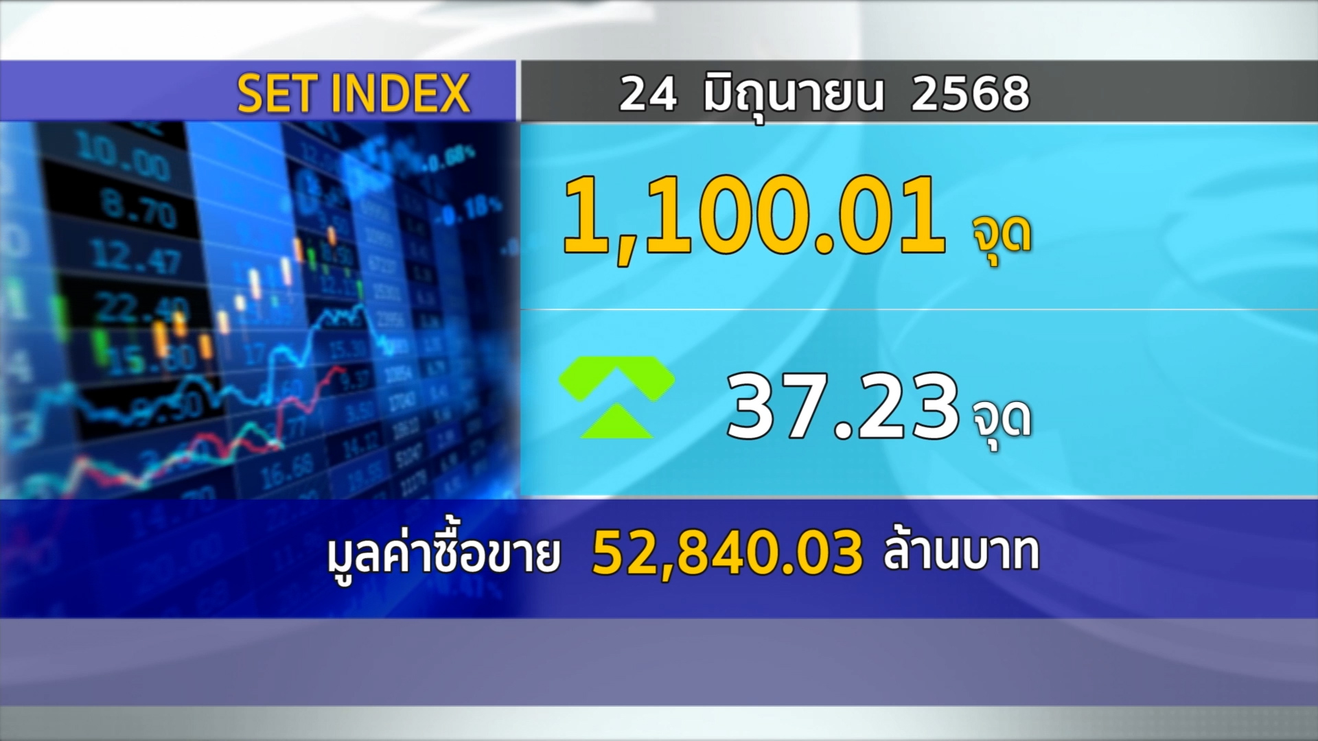 SET ปิดวันนี้ที่ 1,100.01 จุด เพิ่มขึ้น 37.23 จุด (+3.50%) มูลค่าซื้อขาย 52,840.03 ล้านบาท นักวิเคราะห์ฯ ระบุตลาดหุ้นไทยวันนี้ outperform ภูมิภาค ปัจจัยหนุนหลักมาจากข้อตกลงหยุดยิงของอิสราเอลและอิหร่าน รวมถึงภาพรวมการเมืองไทยหลังรัฐบาลยังเดินหน้าต่อได้ โดยในวันนี้ผ่านงบกระตุ้นเศรษฐกิจ 1.15 แสนล้านบาท แนวโน้มวันพรุ่งนี้คาดตลาดอาจพักตัว แนะติดตาม กนง. พร้อมให้แนวต้าน 1,110 จุด และแนวรับ 1,080 จุด – สำนักข่าวไทย