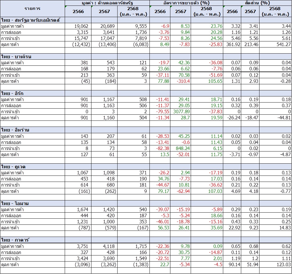 อนึ่ง ภูมิภาคตะวันออกกลาง (Middle East) ถือเป็นตลาดที่สำคัญต่อประเทศไทย โดยมีสัดส่วนส่งออกของไทย ในปี 2567 เท่ากับ 3.5% ของมูลค่าการส่งออกทั้งหมด ตัวอย่างสินค้าที่เริ่มชะลอคำสั่งซื้อเพื่อรอดูถานการณ์ให้ชัดเจนมากขึ้นได้แก่ ข้าว ไก่ ยางพารา อาหาร และเครื่องใช้ไฟฟ้า ขณะที่สินค้ายานยนต์จะได้รับผลกระทบจากการปิดช่องแคบฮอร์มุซในวงจำกัดเพราะสามารถขนส่งผ่านท่าเรือเจดดาห์และท่าเรืออื่นในทะเลแดง