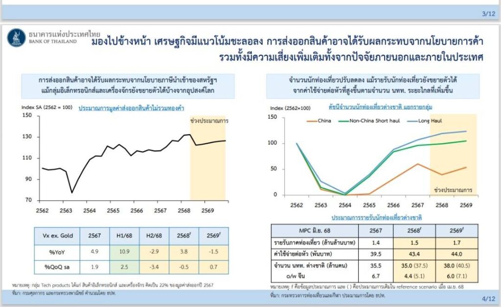 กนง. คาดการณ์ว่าเศรษฐกิจไทยในปี 2568 จะขยายตัวร้อยละ 2.3 และชะลอลงเหลือร้อยละ 1.7 ในปี 2569 หนึ่งในปัจจัยเสี่ยงสำคัญคือแนวโน้มการส่งออกที่ยังชะลอตัว โดยเฉพาะผลกระทบจากนโยบายการค้าของสหรัฐฯ แม้ขอบเขตความไม่แน่นอนจากสงครามการค้าจะลดลงเมื่อเทียบกับช่วงก่อนหน้า แต่ยังต้องติดตามผลการเจรจาภาษีอย่างใกล้ชิด โดยในกรณีฐาน กนง. สมมติว่าภาษีนำเข้าสหรัฐฯ สำหรับสินค้าจากไทยจะอยู่ที่ประมาณ 18% ซึ่งอาจสูงกว่าบางประเทศที่เป็นคู่แข่งทางการค้า