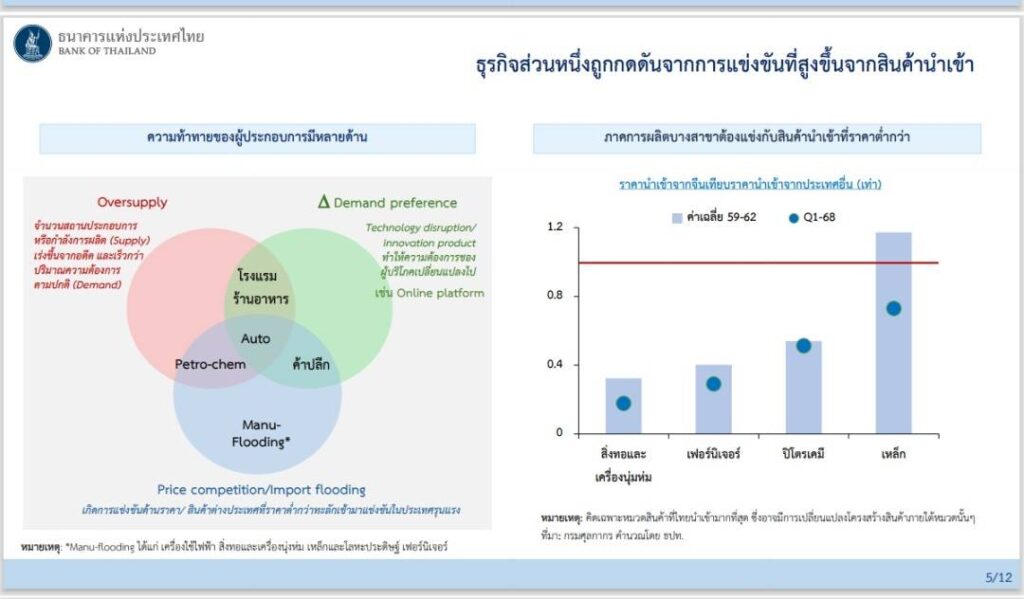 อีกหนึ่งแรงกดดันคือปัญหา Over Supply และการนำเข้าสินค้าราคาต่ำจากต่างประเทศ ซึ่งส่งผลกระทบอย่างรุนแรงต่อผู้ประกอบการรายย่อยและ SMEs โดยเฉพาะในกลุ่มธุรกิจอาหารและบริการ เช่น ร้านอาหารและโรงแรม ที่เปิดเพิ่มขึ้นจำนวนมากในช่วงไม่กี่ปีที่ผ่านมา แต่รายได้เฉลี่ยต่อรายลดลงจากการแข่งขันและจำนวนนักท่องเที่ยวที่ไม่เป็นไปตามคาด