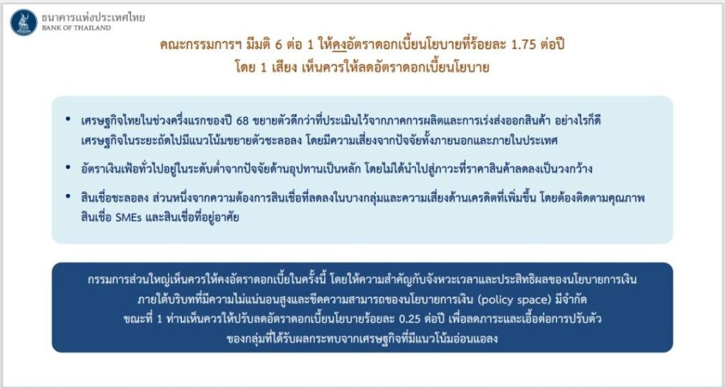 นายสักกะภพ พันธ์ยานุกูล เลขานุการคณะกรรมการนโยบายการเงิน (กนง.) แถลงผลการประชุมคณะกรรมการนโยบายการเงิน ครั้งที่ 3/2568 เมื่อวันที่ 25 มิถุนายน 2568 ว่า คณะกรรมการฯ มีมติ 6 ต่อ 1 เสียง ให้คงอัตราดอกเบี้ยนโยบายไว้ที่ร้อยละ 1.75 ต่อปี โดยกรรมการ 1 ท่านเสนอให้ปรับลดอัตราดอกเบี้ยลง 0.25% เหลือร้อยละ 1.50 เพื่อบรรเทาภาระทางการเงินของกลุ่มเปราะบาง และสนับสนุนการปรับตัวทางเศรษฐกิจในช่วงชะลอตัว