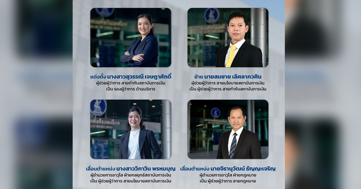 - เลื่อนตำแหน่ง นางสาววิภาวิน พรหมบุญ ผู้อำนวยการอาวุโส ฝ่ายกลยุทธ์สถาบันการเงิน เป็น ผู้ช่วยผู้ว่าการ สายนโยบายสถาบันการเงิน