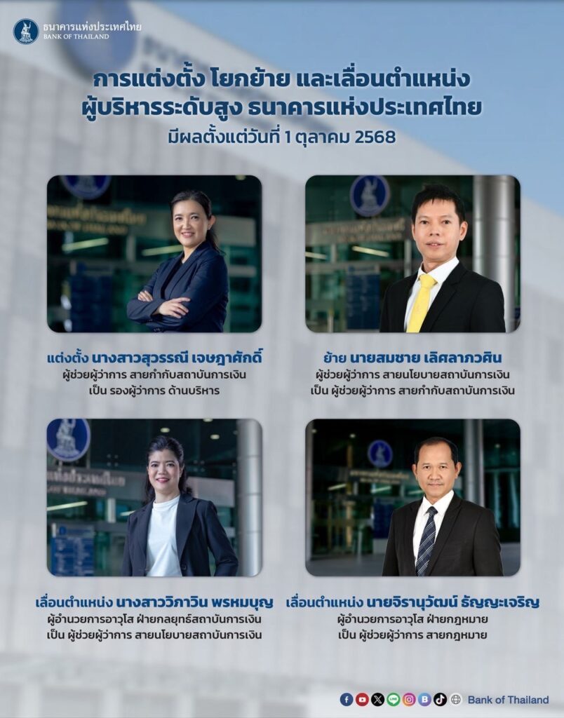 นางสาวดวงพร รอดเพ็งสังคหะ ผู้ช่วยเลขานุการคณะกรรมการธนาคารแห่งประเทศไทย เปิดเผยว่า ในการประชุมคณะกรรมการธนาคารแห่งประเทศไทยวันนี้ ( 25 มิ.ย. 2568) คณะกรรมการฯ มีมติแต่งตั้ง โยกย้าย และเลื่อนตำแหน่งผู้บริหารระดับสูง โดยให้มีผลตั้งแต่วันที่ 1 ตุลาคม 2568 ดังนี้
