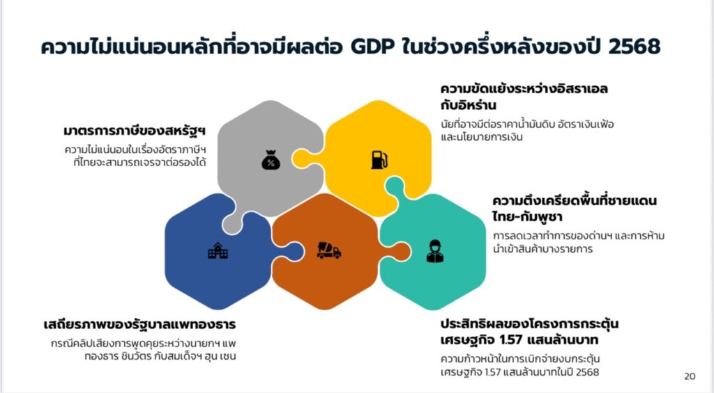 ศูนย์พยากรณ์เศรษฐกิจและธุรกิจมหาวิทยาลัยหอการค้าไทย เปิดเผยว่าภาพรวมเศรษฐกิจไทยปี 2568 เผชิญแรงกดดันรุนแรง จากปัจจัยภายนอก มาตรการภาษีของสหรัฐฯ และความขัดแย้งระหว่างอิสราเอลกับอิหร่าน ขณะที่ปัจจัยภายในประเทศ ได้แก่ เสถียรภาพของรัฐบาล ความตึงเครียดของพื้นที่ชายแดนไทย-กัมพูชา อย่างไรก็ตาม ยังมีปัจจัยหนุนจากโครงการกระตุ้นเศรษฐกิจ 1.57 แสนล้านบาท ประเมินว่า มาตรการภาษีของสหรัฐฯ จะกระทบการส่งออกหนัก คาดว่าจะลดการส่งออกลง 1.26-1.93% ขึ้นอยู่กับผลการเจรจา ขณะที่สินค้าจีนไหลทะลักเข้าไทยเพิ่มขึ้นอย่างต่อเนื่อง การลงทุนเอกชนหดตัวต่อเนื่องเป็นไตรมาสที่ 4 คาดหดตัว -1.2% ใน 2568 สะท้อนความเชื่อมั่นที่อ่อนแอและปัญหาโครงสร้างที่ลึกซึ้ง