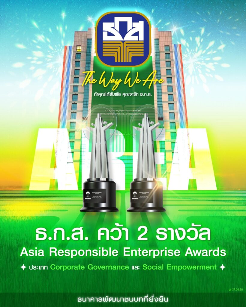 กรุงเทพฯ 27 มิ.ย.- ธ.ก.ส. คว้ารางวัล Asia Responsible Enterprise Awards (AREA) 2025 รางวัลระดับภูมิภาคเอเชียถึง 2 รางวัล ตอกย้ำการเป็นองค์กร ต้นแบบ ของการดำเนินงานโดยคำนึงถึงการกำกับดูแลองค์กรที่ดีอย่างมีธรรมาภิบาล และการสร้างประโยชน์ให้กับสังคมไปสู่ความยั่งยืนในระดับสากล