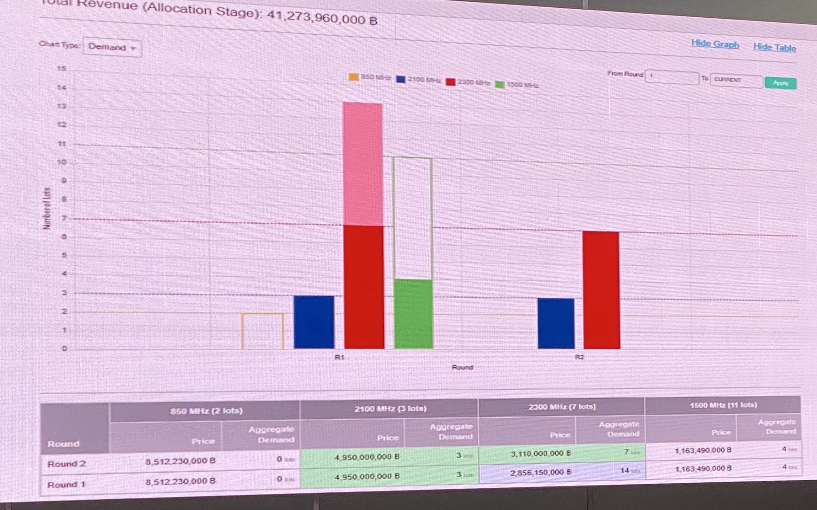 โดยเอกชนทั้งสองราย สนใจเสนอราคาคลื่นความถี่ การประมูลล่าสุด คลื่นความถี่กลุุ่มที่ 2 เป็นคลื่นความถี่ 2,100 MHz จำนวน 2 ชุด ชุดละ 5 MHz ได้มีการเสนอราคาช่วงแรก 4,950 ล้านบาท ต้องการ 3 Slot จากราคาเปิดประมูลขั้นต่ำ 4,500 ล้านบาท ส่วนช่วงความถี่ 2,300 MHz จำนวน 2 ชุด ชุดละ 5 MHz ได้เสนอราคา 3,100 ล้านบาท จากราคาเปิดประมูลขั้นต่ำ 2,596 ล้านบาท โดยระหว่างการประมูล ได้มีกลุ่มผู้ชุมชนประท้วง และปิดประตู สำนักงาน กสทช. เพื่อเรียกร้องให้จัดประมูลอย่างเป็นธรรม และให้บริการประชาชนราคาที่เหมาะสม ไม่ถูกเอาเปรียบจากผู้ประกอบการ